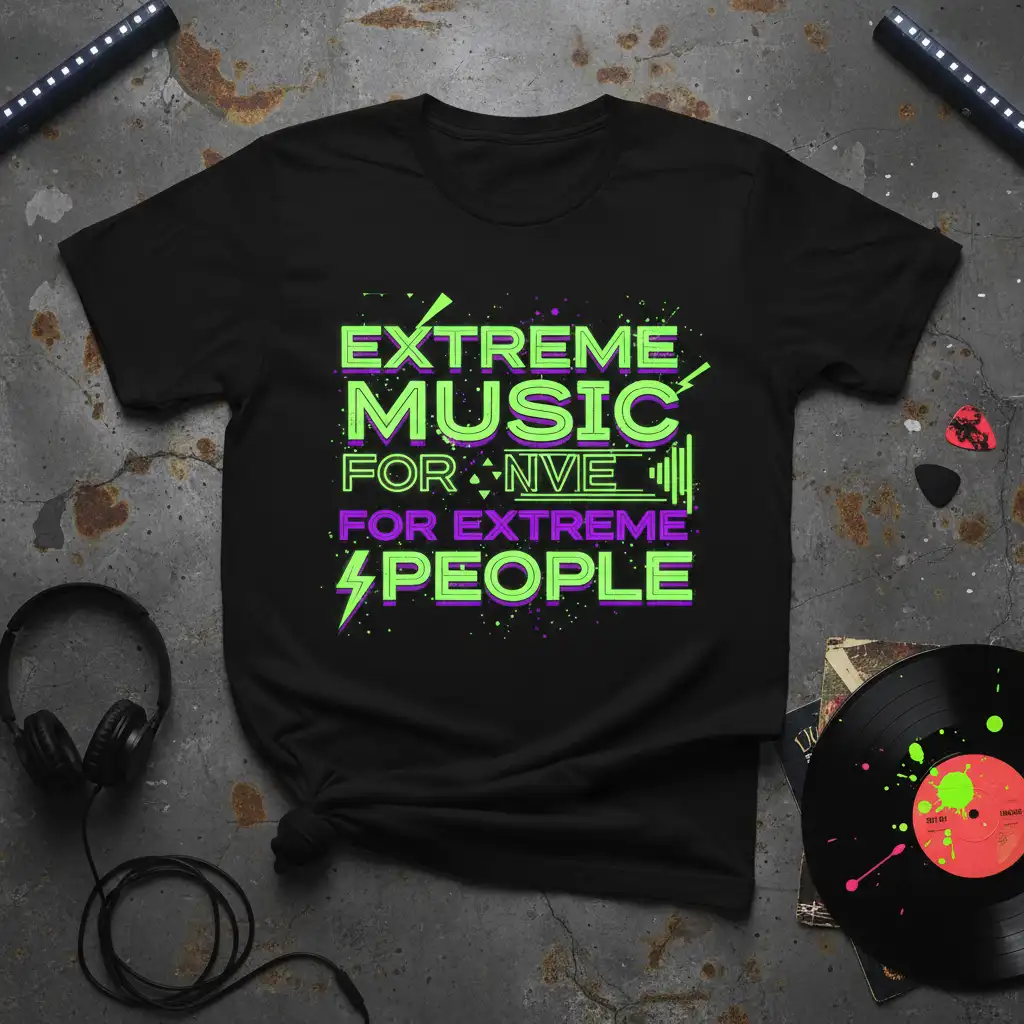 For the dedicated fans of heavy rock, metal, electronic dance music, or any genre that demands high volume and high energy, this t-shirt is your new go-to. The “EXTREME MUSIC FOR NVE FOR EXTREME PEOPLE” text is emblazoned with a style that matches the intensity of the music itself. It’s a wearable anthem for anyone who lives for the drop, the riff, and the thundering basslines that define their auditory world.