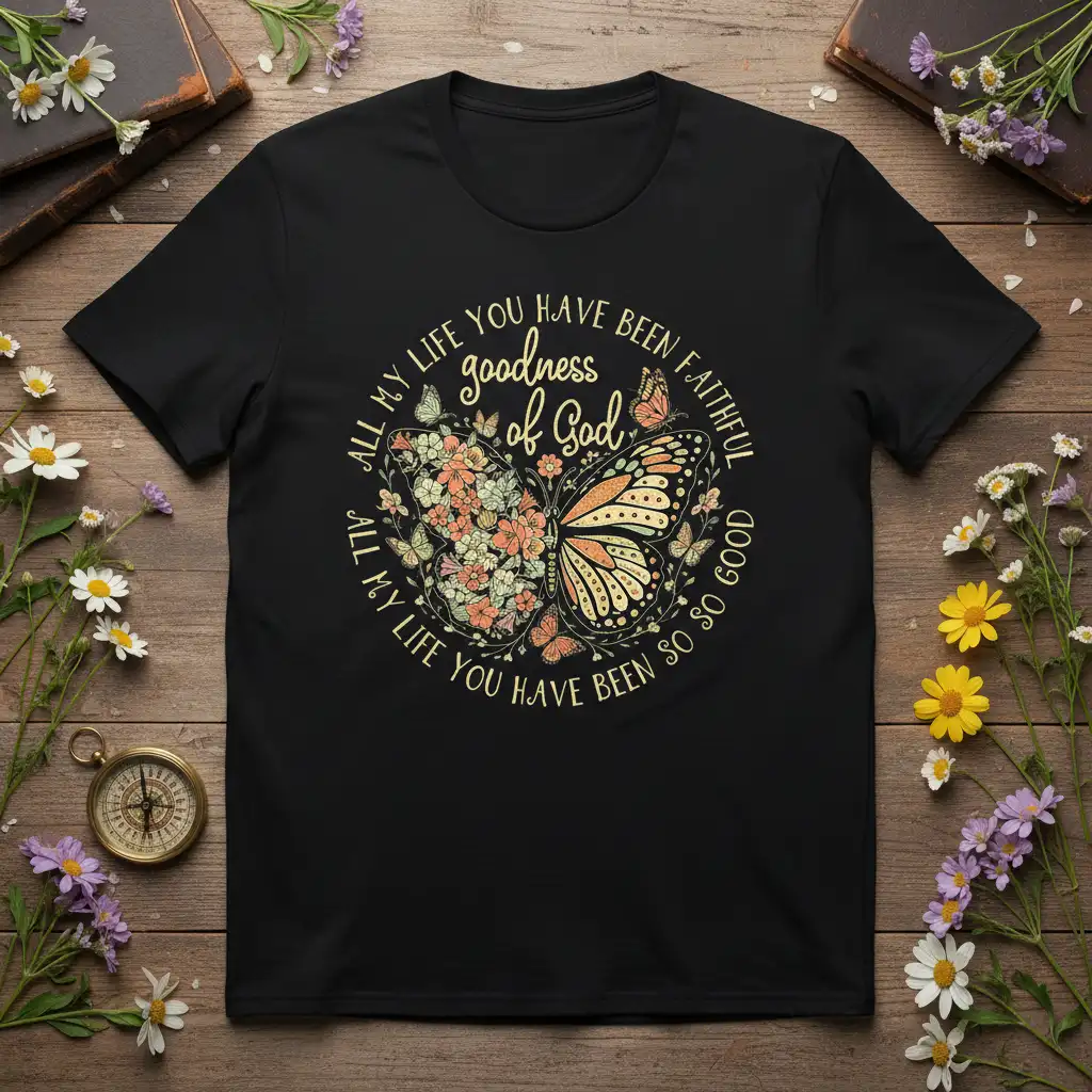 Celebrate the unwavering goodness and faithfulness of God with this beautiful Christian t-shirt. Featuring a stunning butterfly and floral design with an inspiring quote, this tee is a wonderful way to express your spiritual journey. It’s crafted for comfort and designed to be a lasting reminder of divine blessings.