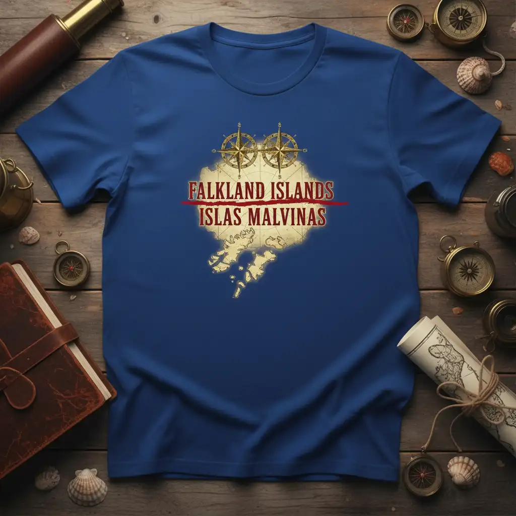 This distinctive t-shirt features a detailed map of the Falkland Islands, also recognized as Islas Malvinas, intricately designed to appeal to your sense of adventure. The graphic is complemented by two elegant, vintage-style compasses, symbolizing guidance and the spirit of exploration that draws people to distant shores. It’s more than just apparel; it’s a wearable piece of history and geography, designed for those who carry the call of the sea and the allure of discovery within them.
