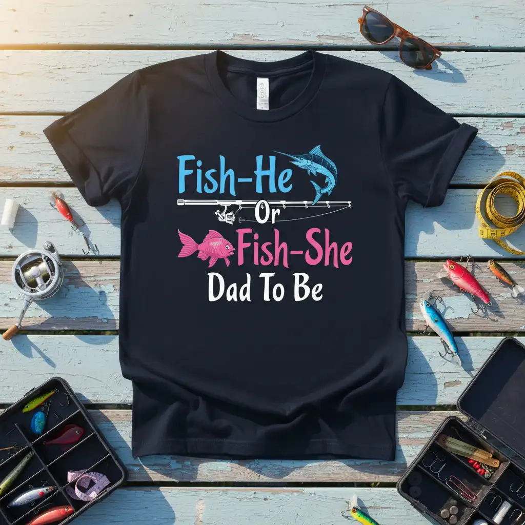 Pick from Black, Navy, Royal, Dark Heather, Red, and White to match your mood and wardrobe staples. Each colorway keeps the Fish-He Or Fish-She Dad To Be design clear and photo-ready for everyday wear.