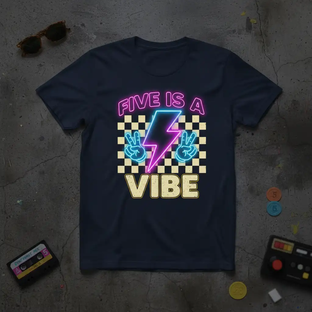 The design features a striking neon lightning bolt, symbolizing energy and excitement, flanked by two peace signs, representing positivity and fun. These elements are set against a classic black and yellow checkered background, adding a distinct retro flair. The phrase “FIVE IS A VIBE” is presented in a bold, glowing neon font, making it the clear centerpiece of the design. This combination creates a visually appealing and thematic t-shirt that stands out.