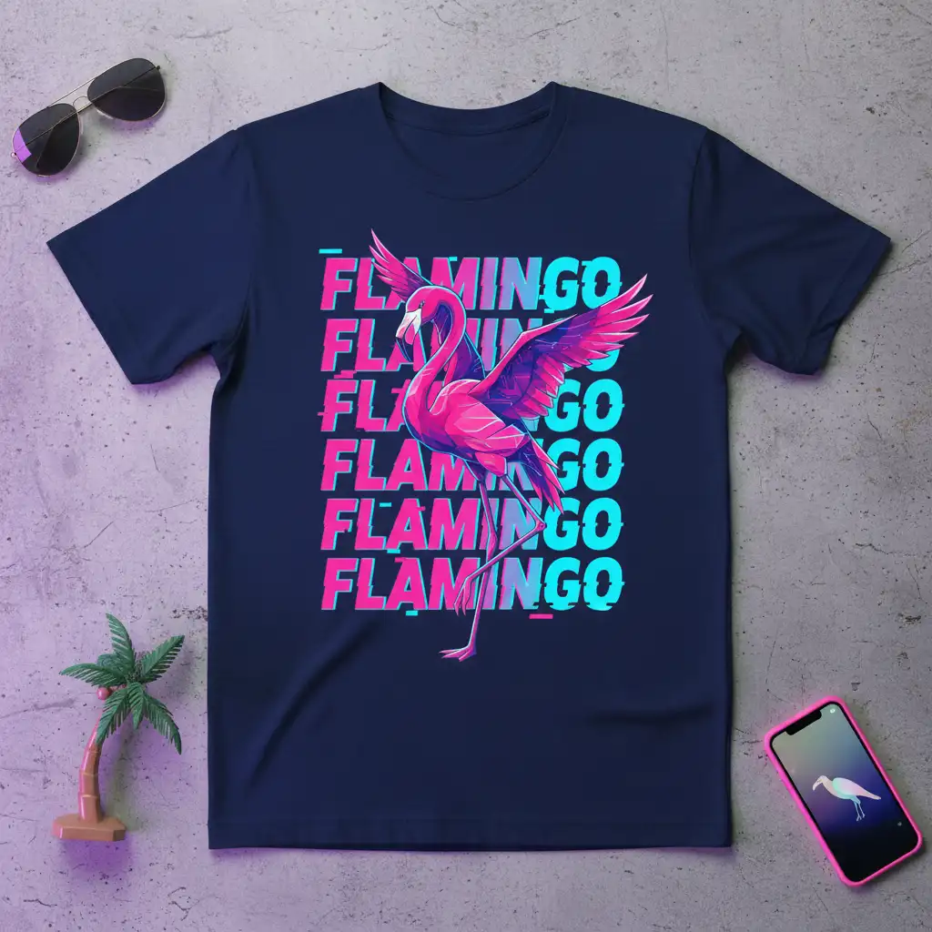 This design is a celebration of bold graphics and vibrant colors. The central flamingo is rendered with sharp, angular lines, giving it a contemporary edge, while the surrounding text adds a playful, almost digital distortion. This combination ensures the graphic is not only visually appealing but also memorable, making it a fantastic conversation starter. It’s ideal for casual outings, summer parties, or simply lounging in style.