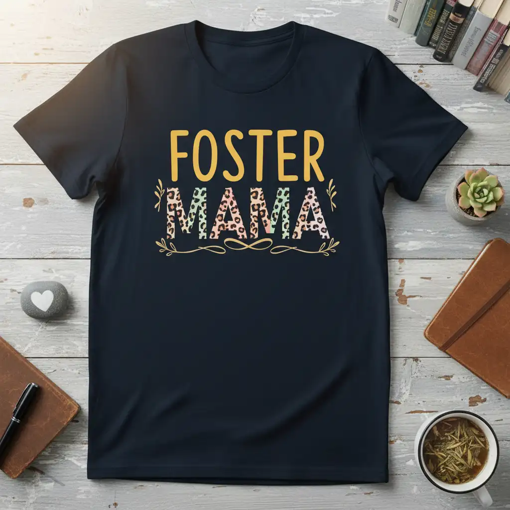 The “FOSTER MAMA” text is rendered in a warm, inviting font, complemented by a fashionable leopard print fill. This combination creates a look that is both meaningful and trendy, making it a standout addition to any wardrobe. It’s a way to subtly, yet powerfully, express the identity and mission of a foster mother.
