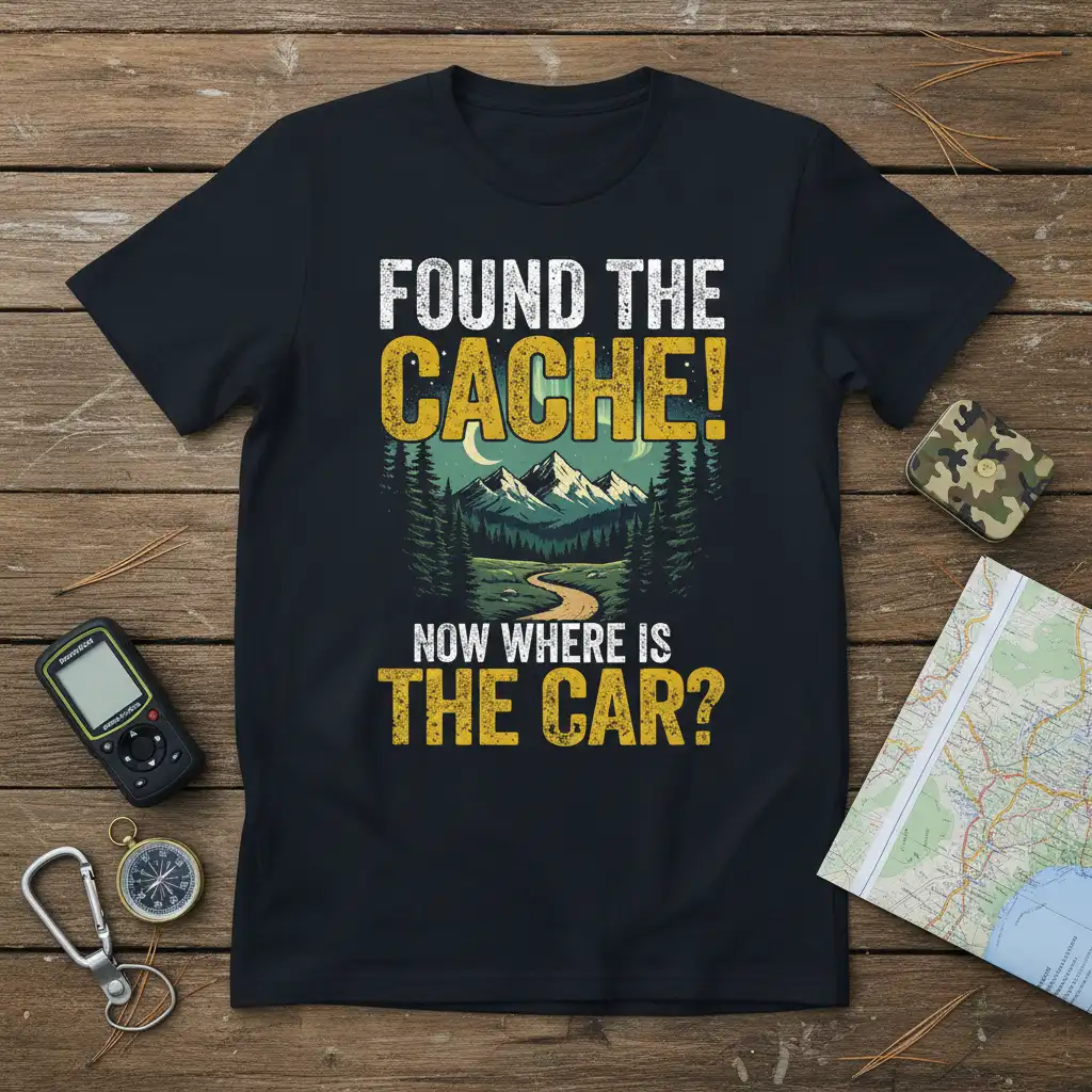 This t-shirt is a must-have for anyone who has ever embarked on a geocaching adventure. It humorously depicts the triumphant moment of finding the hidden cache, only to ponder the next step: locating the car. The design features a striking mountain landscape, complete with trees and a winding path, set against a starry night sky. It perfectly encapsulates the blend of achievement and mild disorientation that can come with a successful treasure hunt.
