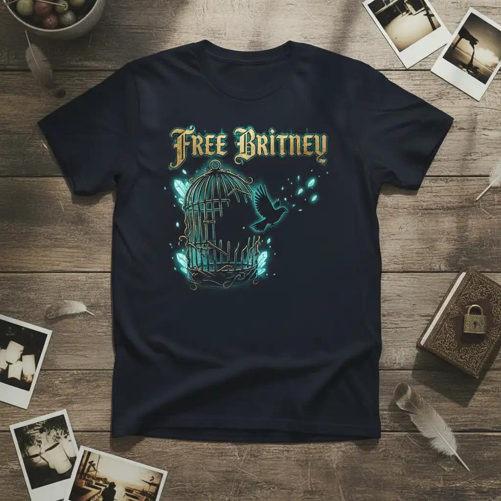 This t-shirt features a compelling visual narrative centered around the “Free Britney” message. The design prominently showcases a stylized bird soaring out of an ornate cage, symbolizing the breaking of chains and the pursuit of freedom. Surrounding the cage are glowing crystals, adding an ethereal and magical quality to the artwork.