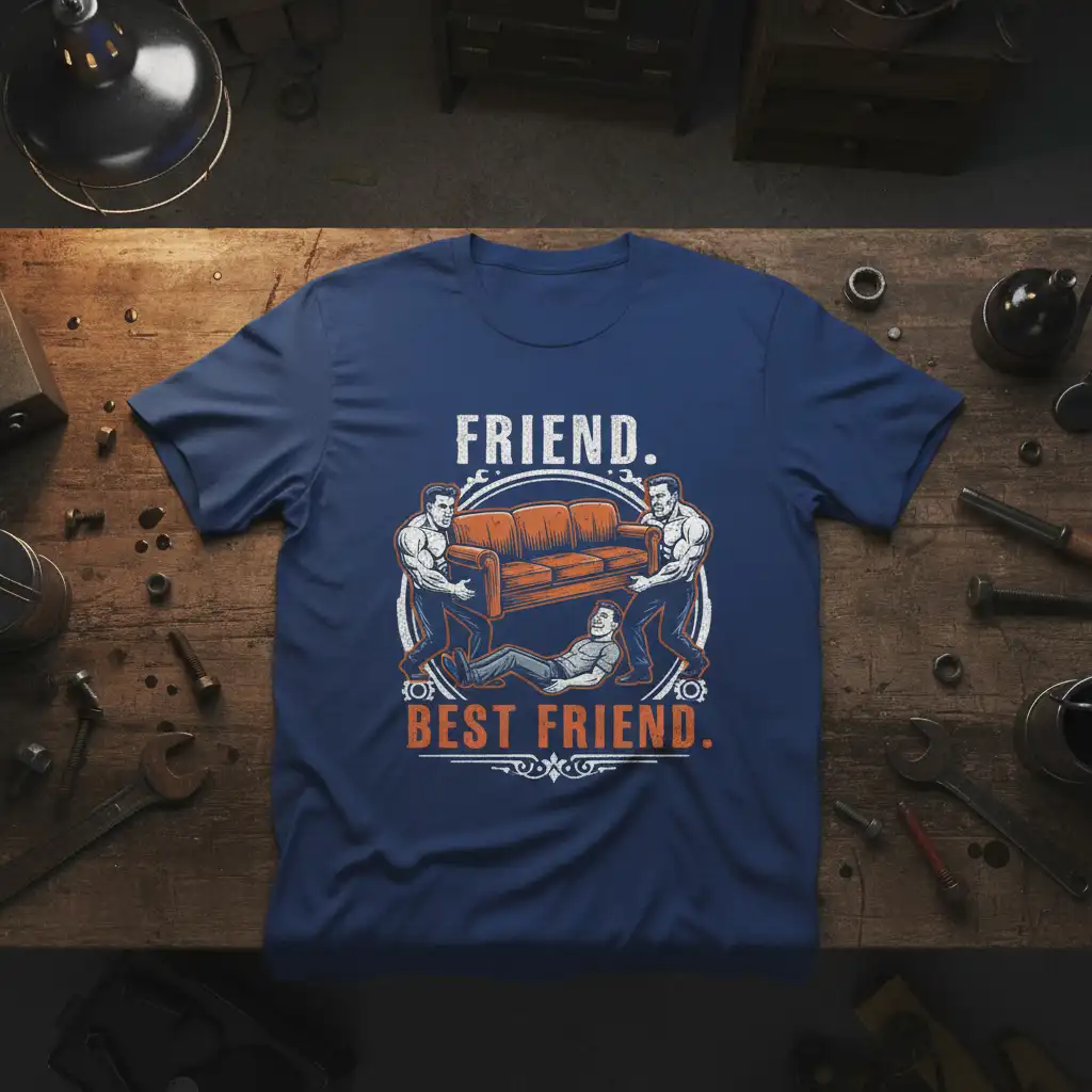 This unique t-shirt features the bold declaration “FRIEND. BEST FRIEND.” above and below a striking illustration. The graphic depicts two strong individuals working together to carry a couch, while a third friend reclines beneath it, embodying the spirit of shared effort and mutual support. It’s a visual representation of how friends can lift each other up, even in the most literal and comical ways. This design resonates with anyone who values their friendships and enjoys a good laugh.