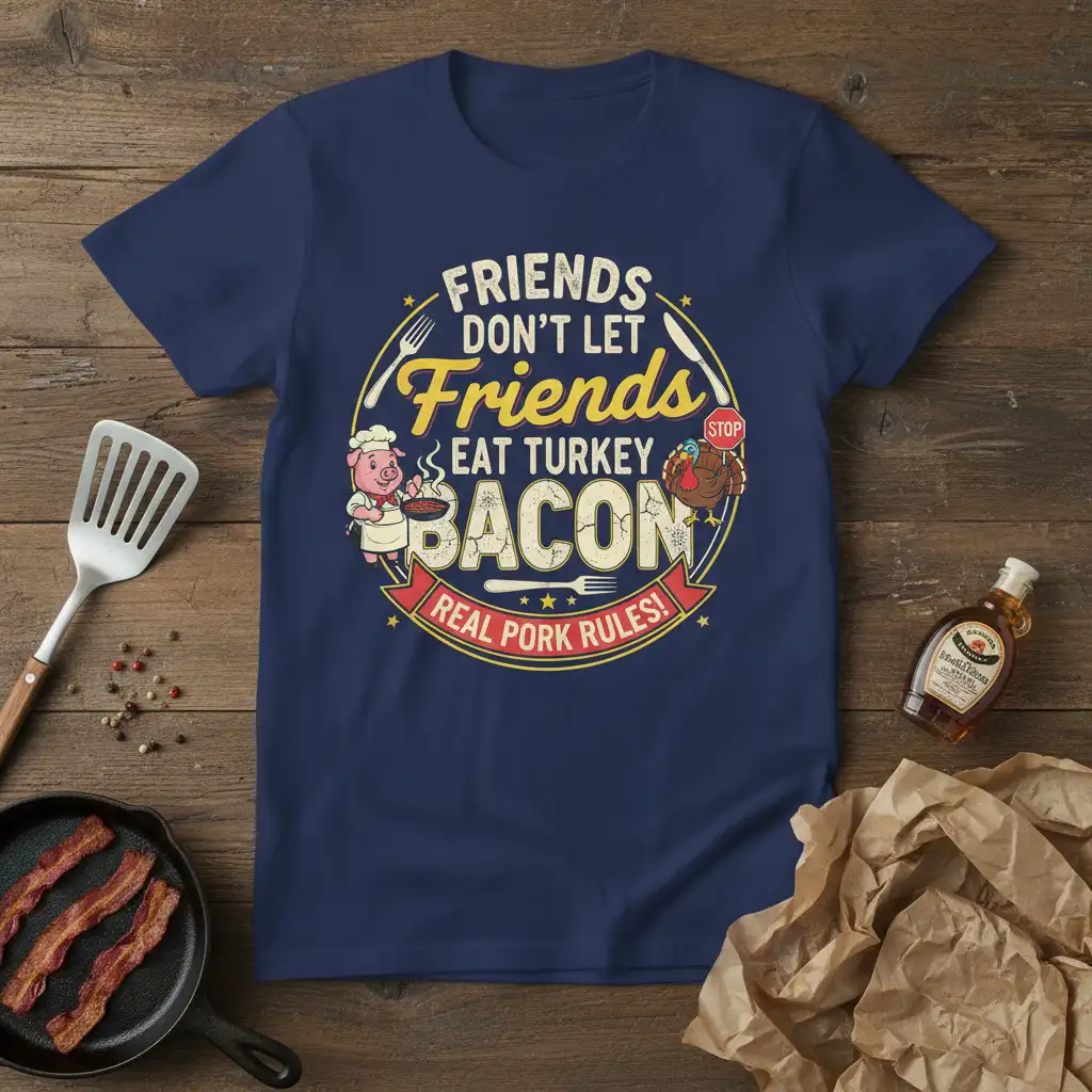 Friends Don’t Let Friends Eat Turkey Bacon Real Pork Rules, and this t-shirt is the perfect way to celebrate that culinary truth. For anyone who believes bacon reigns supreme, this tee is a must-have statement piece. It playfully reminds everyone that while turkey has its place, bacon is king, especially during holidays or any meal. This design captures the spirit of shared food passions and good-natured debates over the best ingredients.