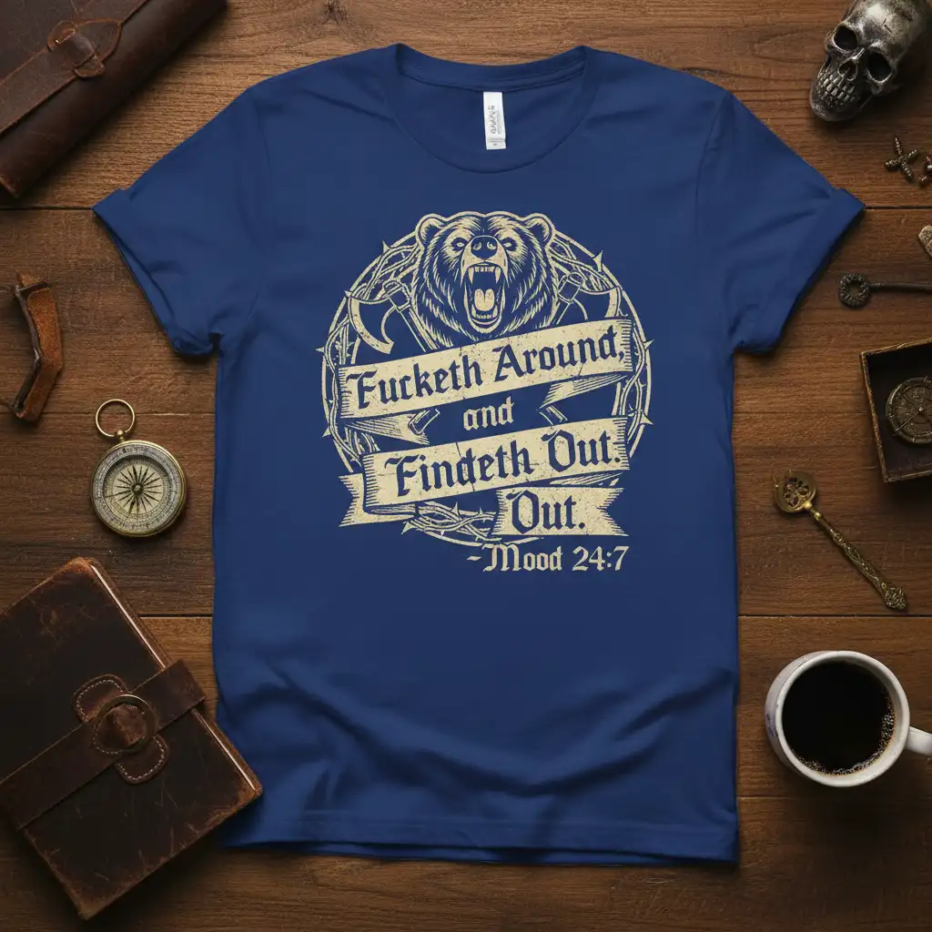 Fucketh Around, and Findeth Out. Out. -Mood 24:7 is more than just a phrase; it’s a declaration of intent and a warning to those who might underestimate you. This powerful t-shirt captures that sentiment with a striking design featuring a fierce bear and bold typography. It’s perfect for individuals who appreciate a bit of dark humor and a no-nonsense attitude, embodying a spirit of primal strength and unapologetic self-expression. Whether you’re looking to make a statement or simply enjoy a well-crafted graphic tee, this design is sure to turn heads and spark conversations.