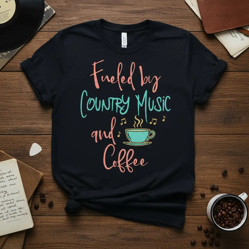 Pick from Black, Navy, Royal, Dark Heather, Red, and White to match your mood and wardrobe staples. Each colorway keeps the Fueled by COUNTRY MUSIC and Coffee design clear and photo-ready for everyday wear.