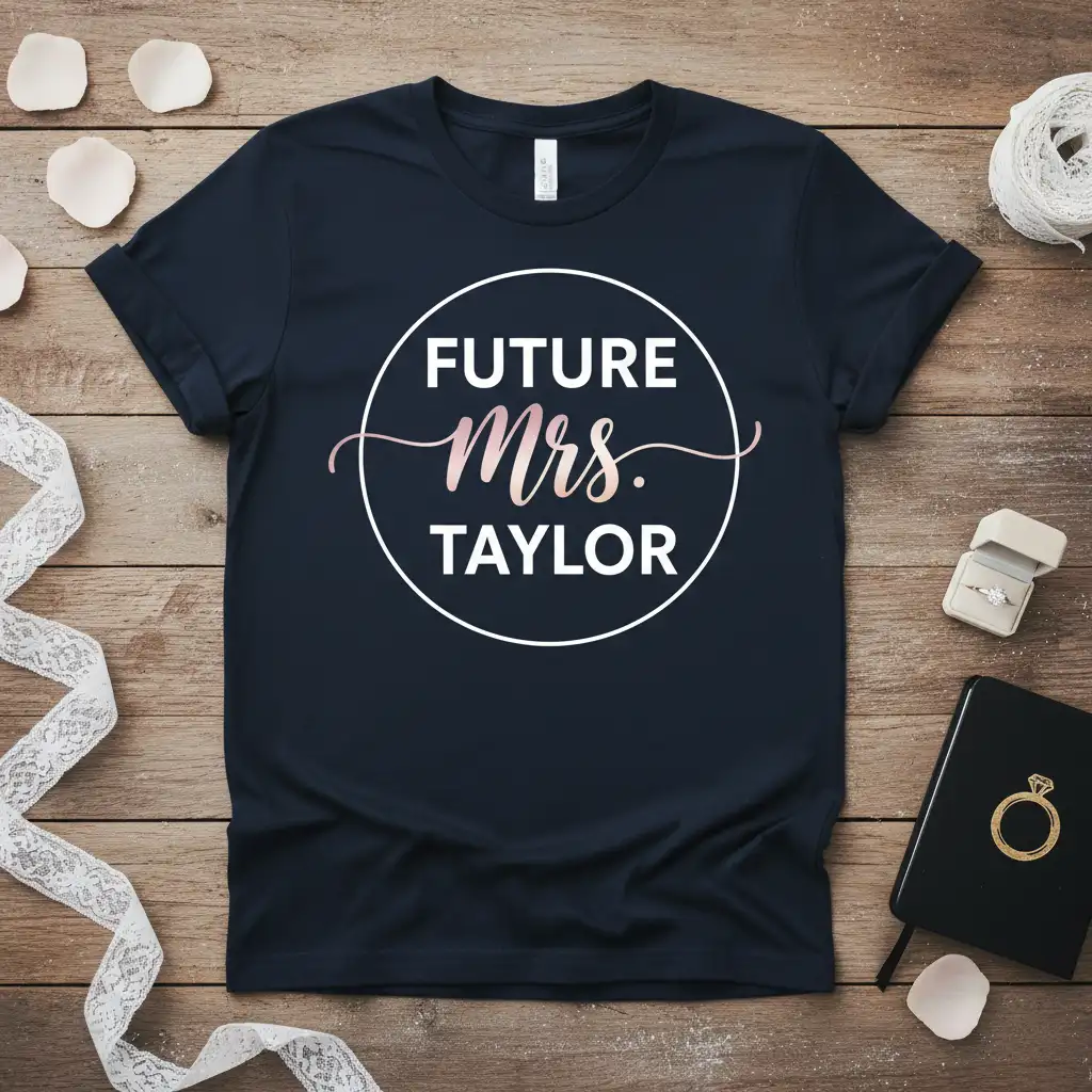 This elegant tee is designed for the bride-to-be who wants to share her joy. The classic circular design encloses bold “FUTURE” and “TAYLOR” text, with “Mrs.” beautifully scripted in a rose gold hue. It’s a subtle yet impactful way to celebrate your transition into married life.