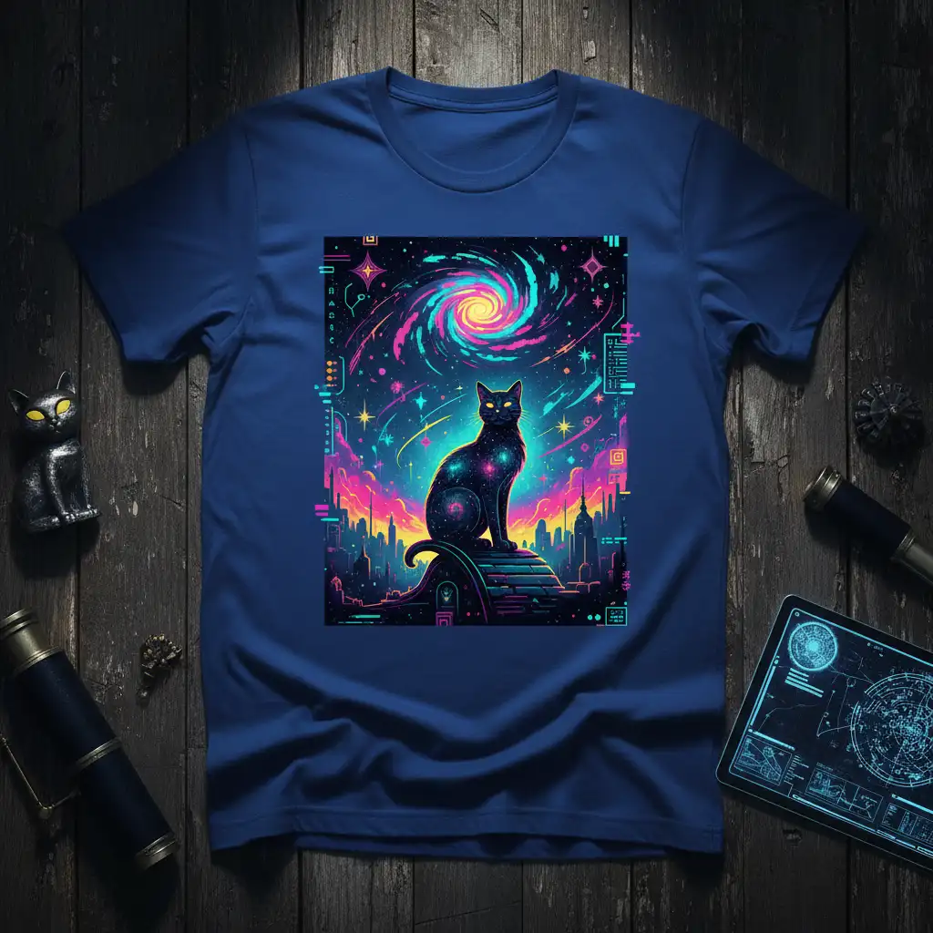 The careful selection of colors ensures that the intricate details of the design pop, making a bold statement. Whether you prefer a classic black base or a more vibrant hue like Royal, there’s an option to suit every personal style. This attention to detail in both sizing and color choices makes the Galaxy Cat Cityscape T-Shirt a truly desirable item.