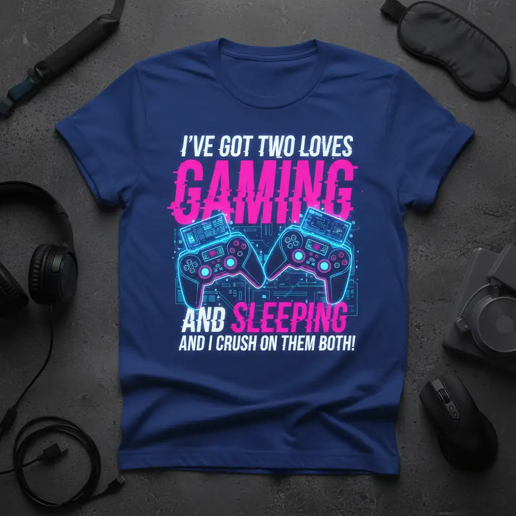 I’ve Got Two Loves Gaming And Sleeping And I Crush On Them Both! This t-shirt is a bold declaration for anyone who lives and breathes video games and cherishes every moment of sleep. It perfectly captures the relatable struggle and joy of balancing intense gaming sessions with the ultimate need for rest. This design is more than just apparel; it’s a badge of honor for the dedicated gamer who also knows the value of a good night’s sleep. Show the world your unique priorities and make a statement with this comfortable and stylish tee.