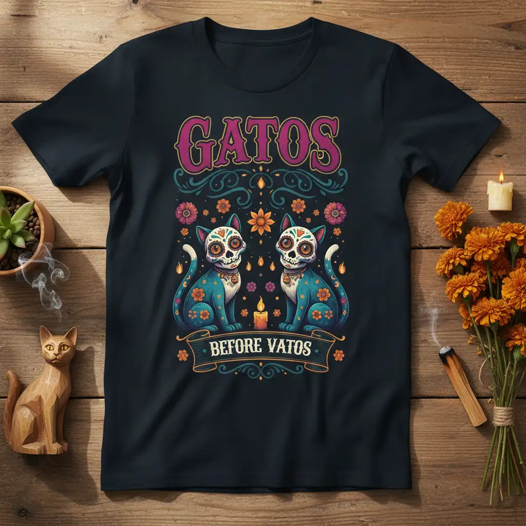 This “Gatos Before Vatos” tee is the ultimate way to showcase your dedication to cats. The phrase itself is a declaration of love and priority, humorously placing our feline friends above all else. The artistic execution of the sugar skull cats adds an element of mystique and beauty, transforming a simple t-shirt into a statement piece. It’s designed for comfort and durability, ensuring you can wear your cat-loving pride with ease and confidence, whether you’re out and about or enjoying a cozy day in.