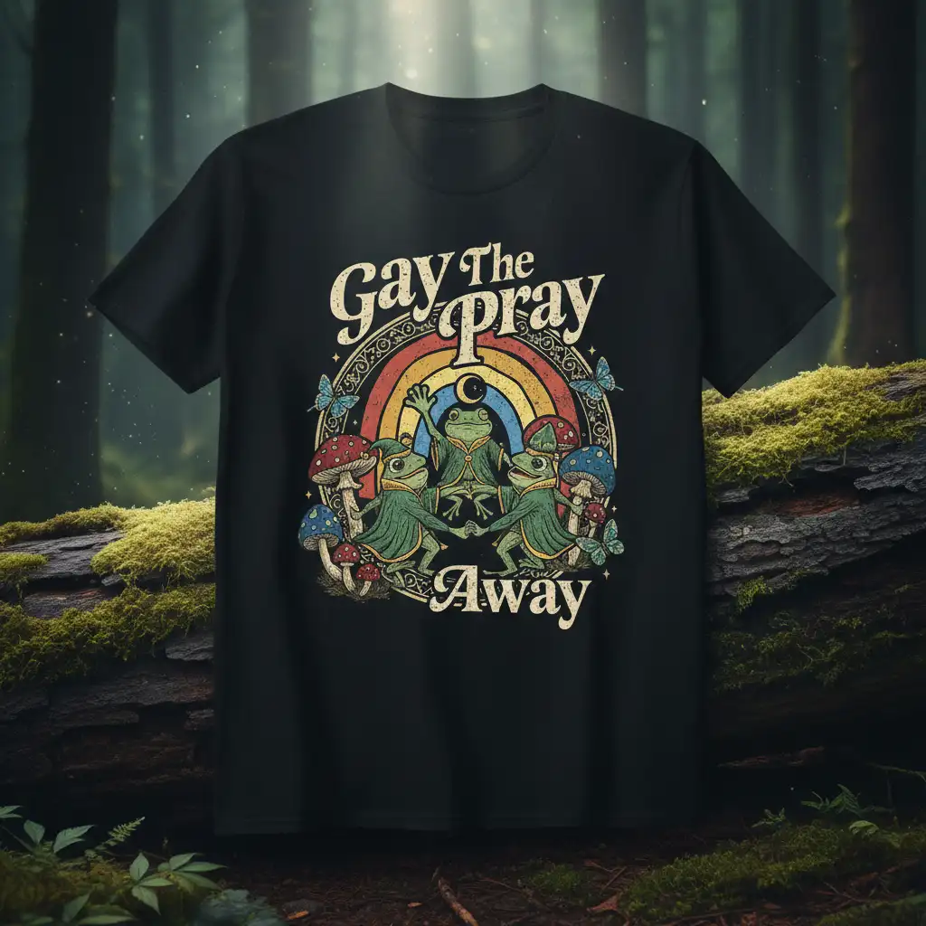 Gay The Pray Away is more than just a catchy phrase; it’s a vibrant celebration of identity, joy, and embracing who you are. This t-shirt design encapsulates a spirit of whimsical rebellion and unapologetic pride, perfect for anyone looking to express their authentic self. Featuring a delightful scene with dancing frogs, mushrooms, and a retro rainbow, it’s a wearable piece of art that spreads positivity and inclusivity. It’s designed to be a conversation starter, a statement of self-love, and a fun addition to any wardrobe.
