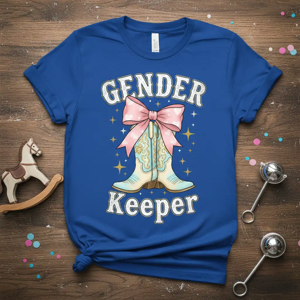 The design features the words “GENDER Keeper” in a stylish font, complemented by illustrated cowboy boots tied with a sweet pink bow. Sparkly stars are scattered around, adding a touch of magic and festivity to the overall look. This visual appeal makes the t-shirt incredibly photogenic, perfect for capturing those memorable moments at your party.