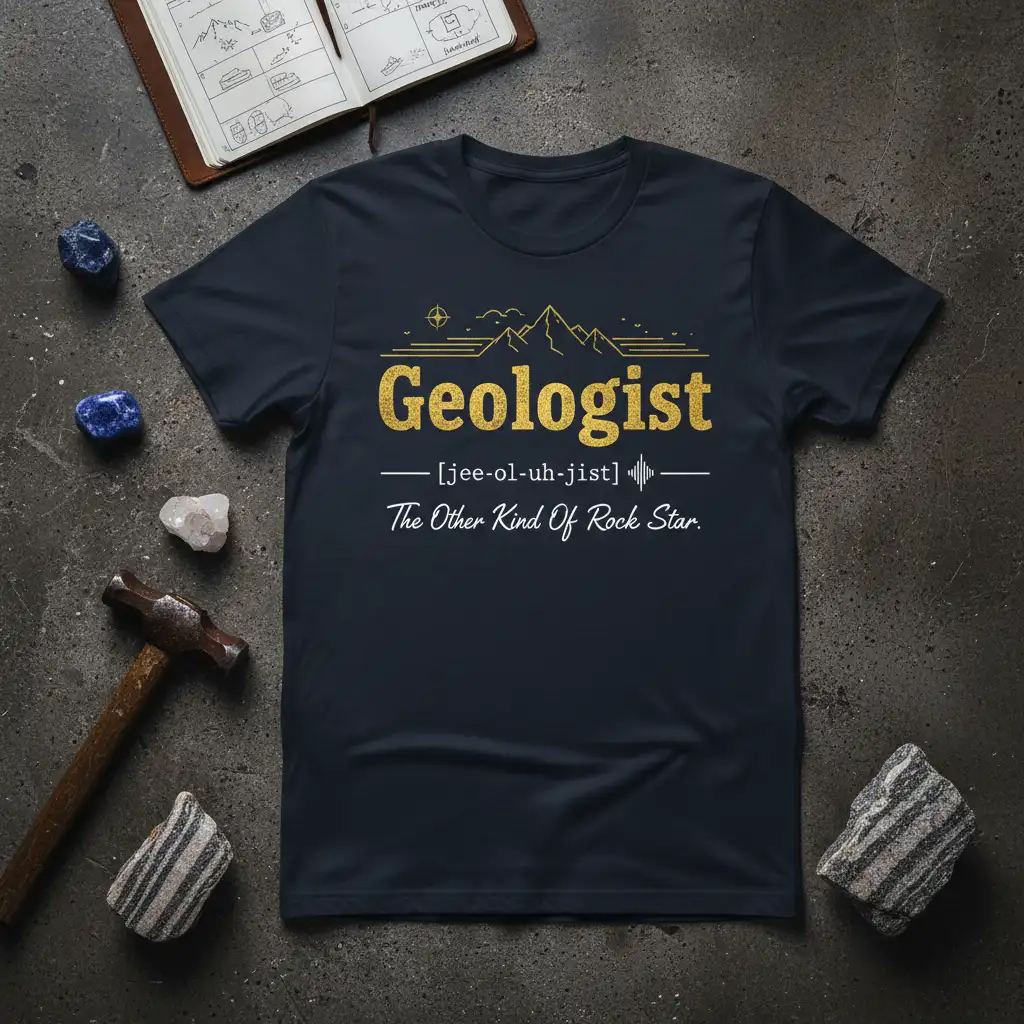 This t-shirt proudly features the word “Geologist” in a bold, glittering font, followed by its phonetic pronunciation to ensure everyone knows how to say it correctly. Below this, the witty tagline “The Other Kind Of Rock Star” is presented, playfully connecting the profession to the iconic status of musicians. The design is further enhanced with stylized mountain graphics and a compass rose, symbolizing exploration and the natural landscapes geologists often study. It’s a design that resonates with the adventurous spirit inherent in earth science.