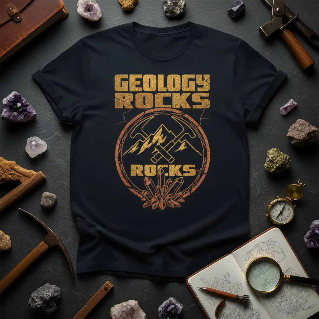 This unique t-shirt proudly displays the motto “GEOLOGY ROCKS ROCKS,” celebrating the field of geology with a cool, retro-inspired design. The graphic features crossed geological hammers, iconic mountain peaks, and a cluster of shimmering crystals, all encased within a circular emblem. The distressed texture adds a vintage feel, making it a standout piece for any wardrobe. It’s perfect for geologists, students, teachers, and hobbyists who share a deep appreciation for the planet’s geological formations and treasures.