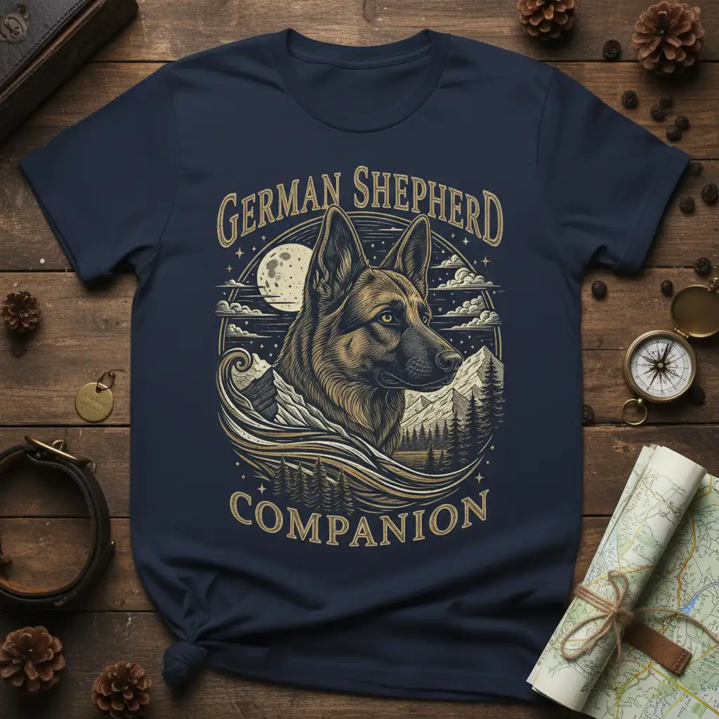 This t-shirt features an exquisite illustration that pays homage to the German Shepherd. The design prominently displays “GERMAN SHEPHERD COMPANION,” encircling a striking portrait of the breed. The artwork is set against a captivating scene of rugged mountains, dense pine forests, and a luminous full moon, evoking a sense of adventure and the wild spirit that often defines these dogs.