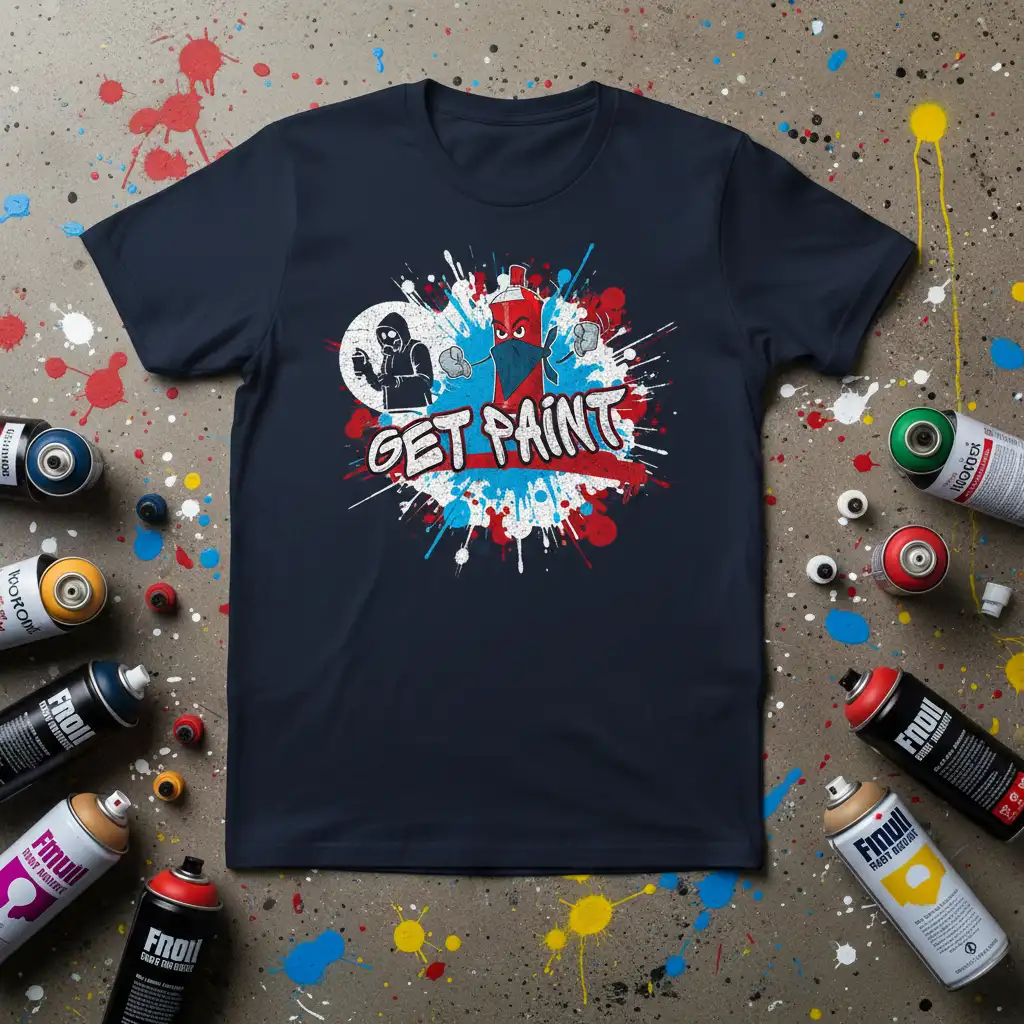 Embrace the spirit of the streets with this eye-catching “GET PAINT” t-shirt. The design features a lively interplay of cartoon characters and explosive paint splatters, all centered around the commanding “GET PAINT” slogan. It’s an ode to the vibrant world of graffiti and urban art culture, designed to stand out. This tee is ideal for making a bold fashion statement and showcasing your appreciation for artistic endeavors.