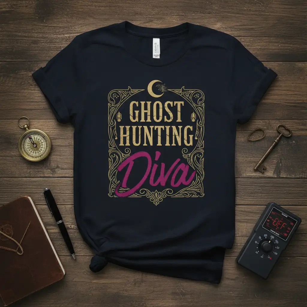 This exclusive t-shirt proudly displays the “Ghost Hunting Diva” text, a declaration of your adventurous spirit and your love for all things paranormal. The design is crafted with intricate detail, featuring elegant typography and a touch of mystique that perfectly complements the theme. It’s an ideal way to express your unique interests and connect with fellow enthusiasts.