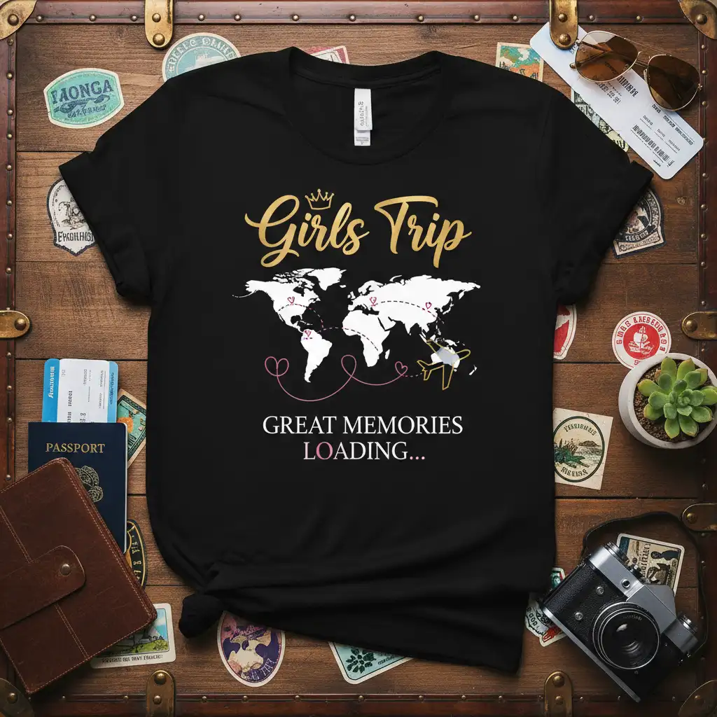 This Girls Trip Great Memories Loading design features a stylized world map, symbolizing the vast possibilities of travel and the adventures that await. Dotted lines connect various points, illustrating the journey and the excitement of exploring new horizons. This visual element adds a layer of depth to the shirt, appealing to the wanderlust in every traveler. It’s a statement piece that speaks volumes about your love for travel and shared experiences.