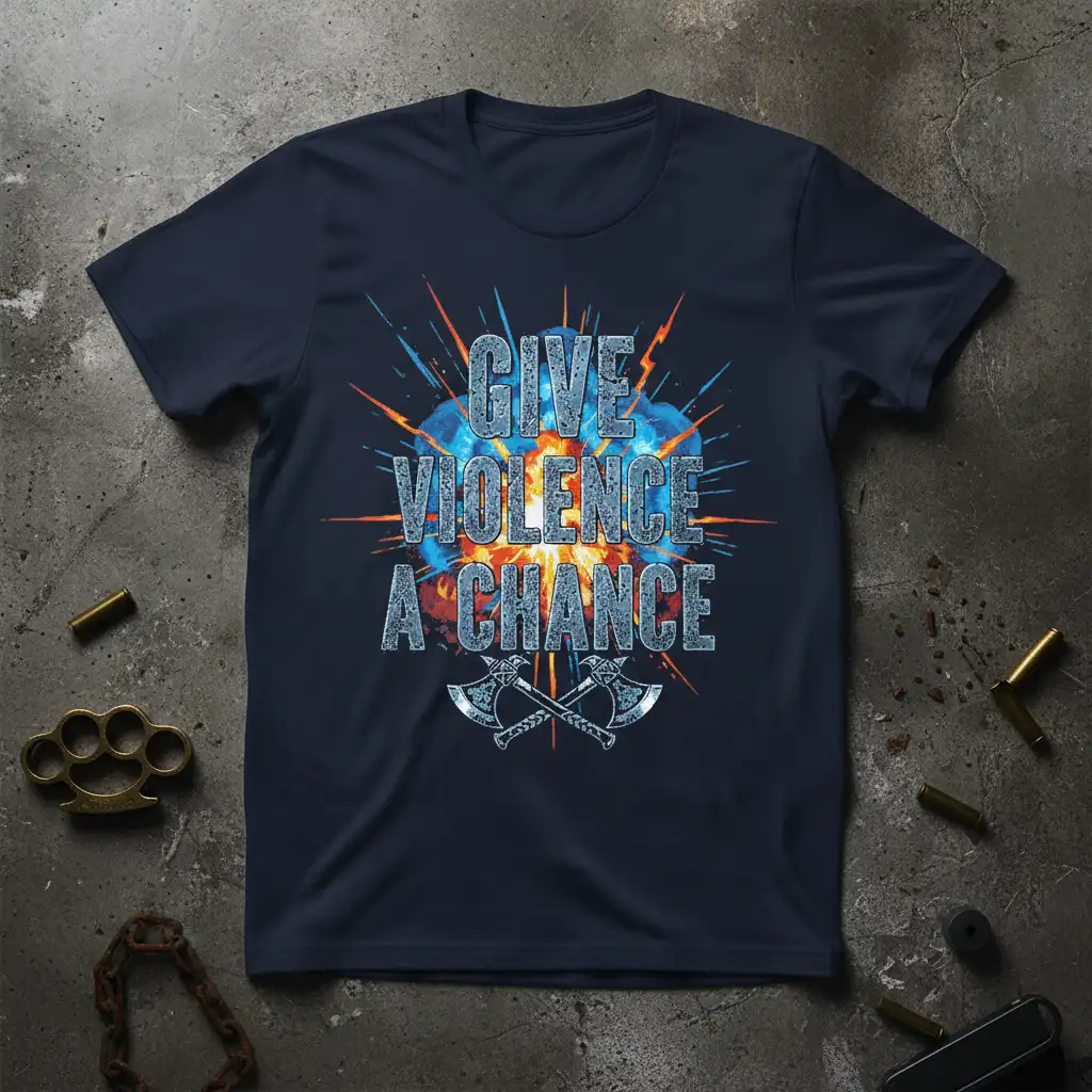 Unleash your edgy side with the GIVE VIOLENCE A CHANCE T-Shirt, perfect for those who appreciate dark humor and bold statements. This high-quality tee features a striking explosive graphic and crossed axes, making it a standout addition to any wardrobe. It offers exceptional comfort and durability for everyday wear.