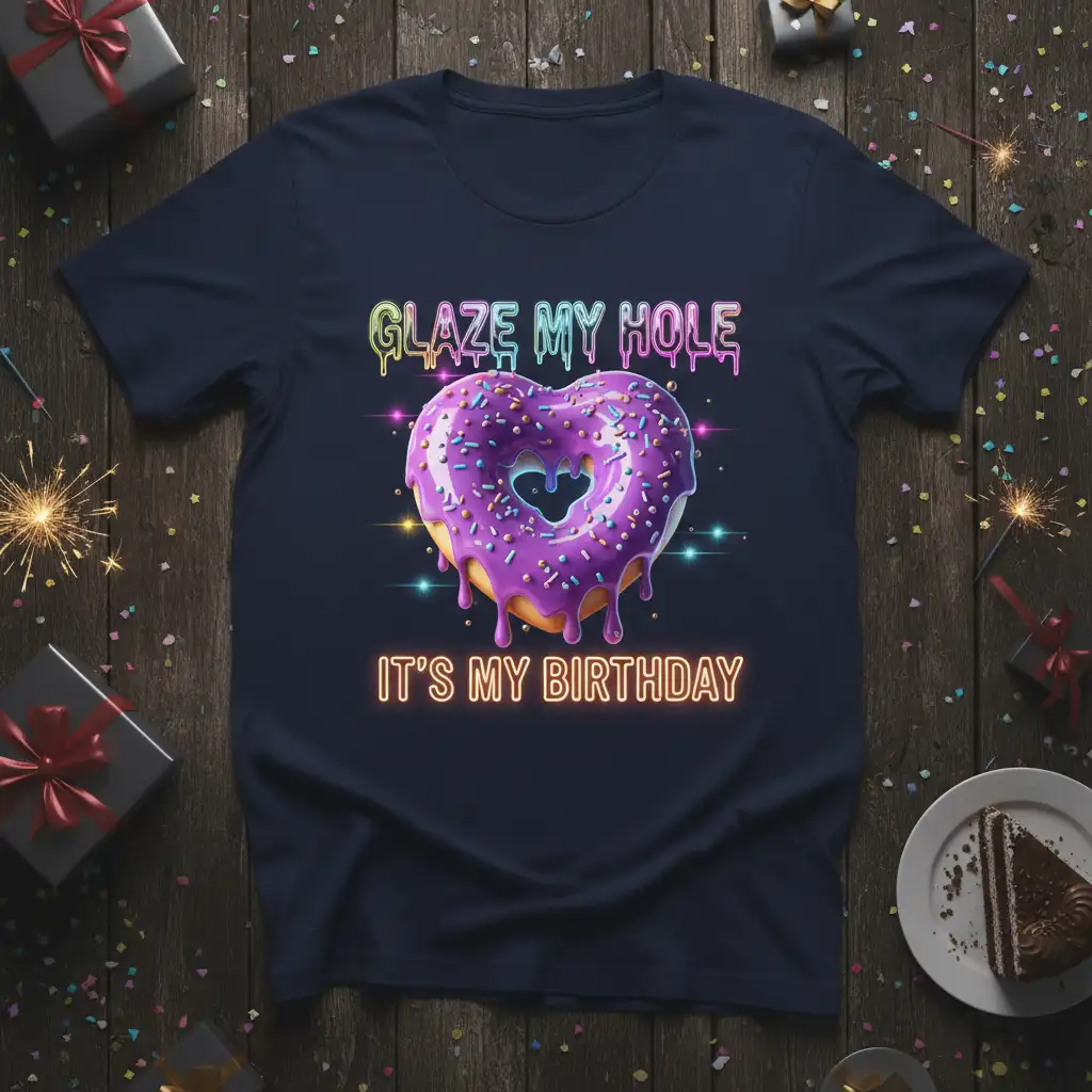 Pick from Black, Navy, Royal, Dark Heather, Red, and White to match your mood and wardrobe staples. Each colorway keeps the GLAZE MY HOLE IT’S MY BIRTHDAY design clear and photo-ready for everyday wear.