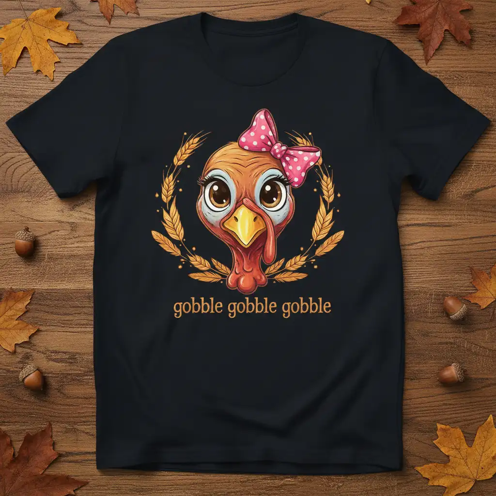 This delightful t-shirt features a cute and friendly cartoon turkey, complete with a charming pink polka dot bow and big, expressive eyes. The design is framed by a rustic wreath of golden wheat, evoking the harvest season and the bounty of Thanksgiving. The playful text “gobble gobble gobble” is elegantly scripted below the turkey, adding a touch of whimsical fun. It’s an ideal way to showcase your love for the holiday and its iconic bird.