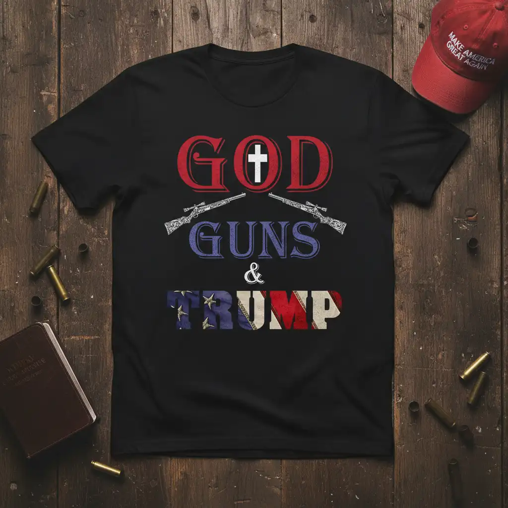 Embrace your identity and express your dedication to the principles that shape our nation. This God Guns & Trump t-shirt is more than apparel; it’s a symbol of your commitment to faith, freedom, and the enduring spirit of America. Don’t miss the opportunity to own this impactful piece of patriotic wear. Order yours today and wear your values with pride!