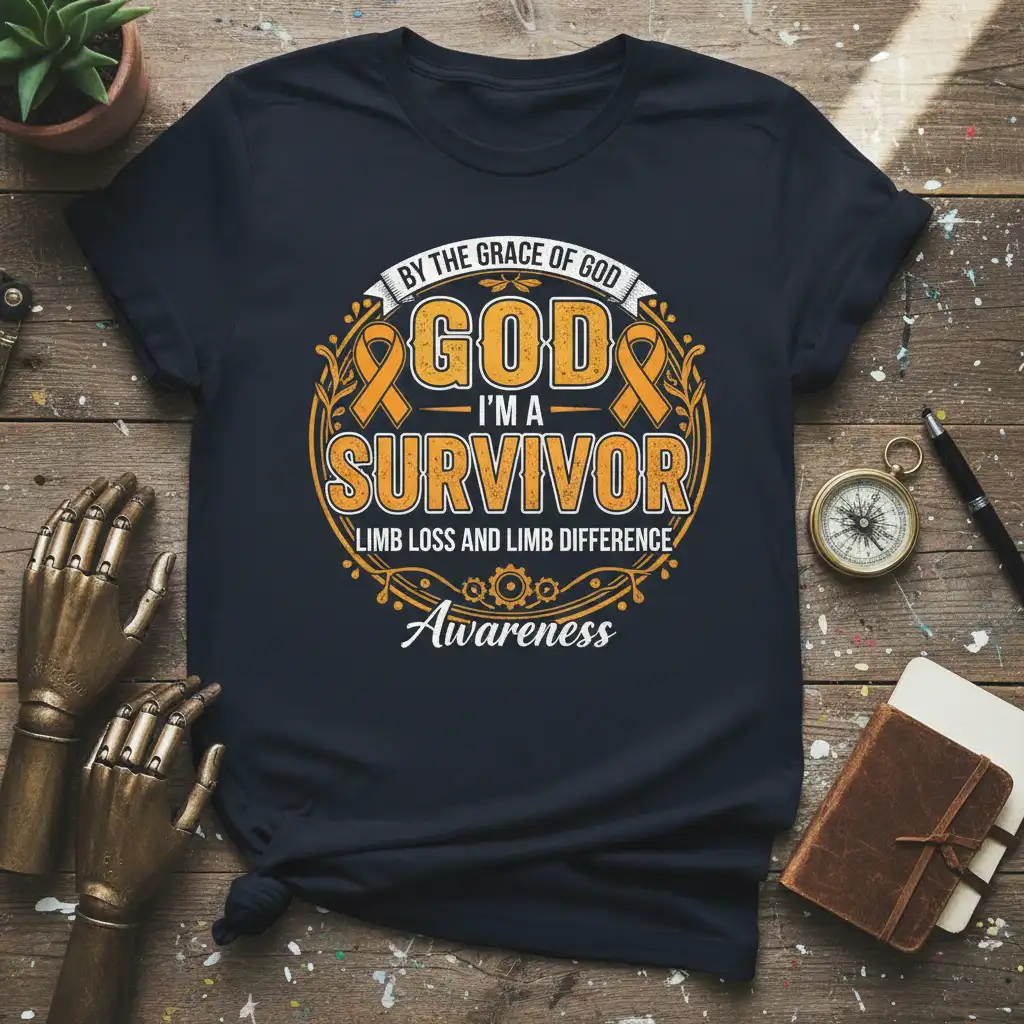 This impactful t-shirt proudly displays the message “By the Grace of God God I’m A Survivor,” emphasizing the spiritual and personal strength required to navigate life with limb loss or limb difference. The prominent “Survivor” text is surrounded by supportive phrases and decorative elements, creating a design that is both visually striking and deeply meaningful. It serves as a constant reminder of the courage found within and the power of community support.
