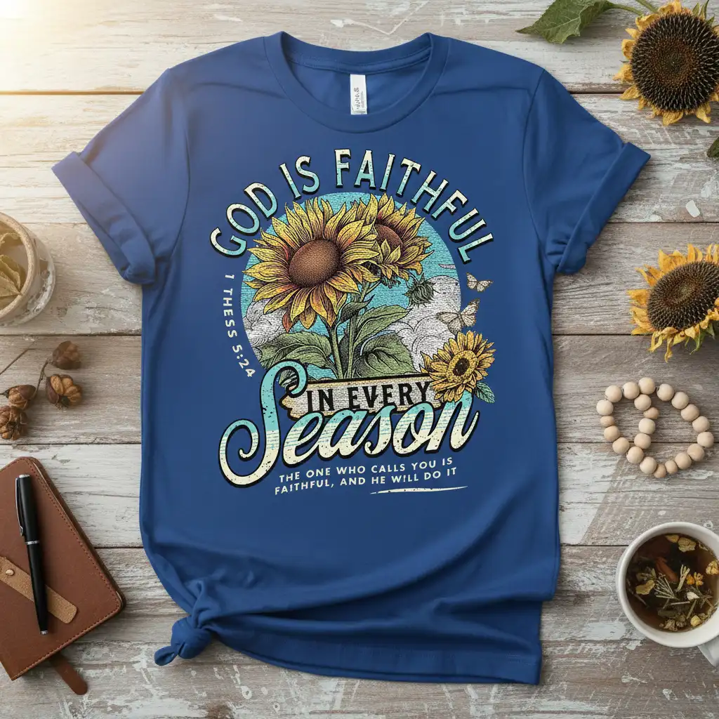 Wearing this “God Is Faithful In Every Season” t-shirt is a statement of profound belief and personal testimony. It’s an invitation to reflect on the unchanging nature of God’s promises and to carry that assurance with you daily. Discover the perfect blend of faith, fashion, and comfort.