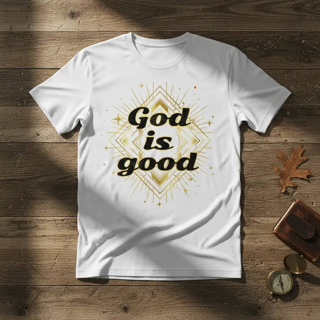 This white t-shirt features the powerful declaration “God is good” in bold, elegant black lettering. The design is further enhanced by a stunning golden geometric starburst pattern, radiating outwards from the text. This celestial motif adds a touch of divine sparkle and emphasizes the uplifting nature of the message. It’s a perfect way to wear your faith and spread positivity wherever you go.