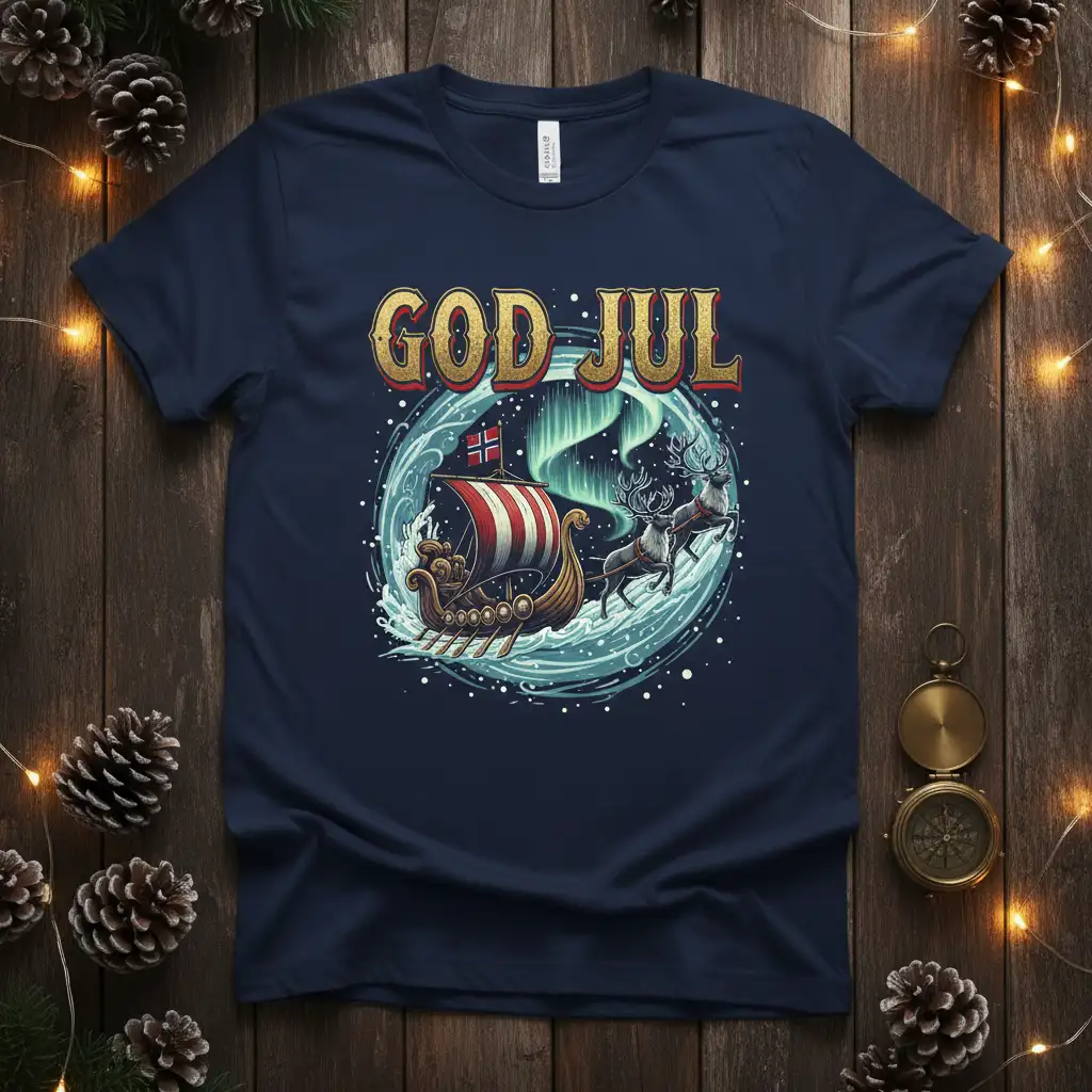 Celebrate the festive season with a design that evokes the spirit of adventure and holiday cheer. This t-shirt features a captivating illustration of a Viking ship sailing under a vibrant aurora borealis, a common sight in Nordic winter skies. The golden lettering of “GOD JUL” prominently displayed above adds a touch of festive warmth, making this garment a perfect representation of a Scandinavian Christmas.