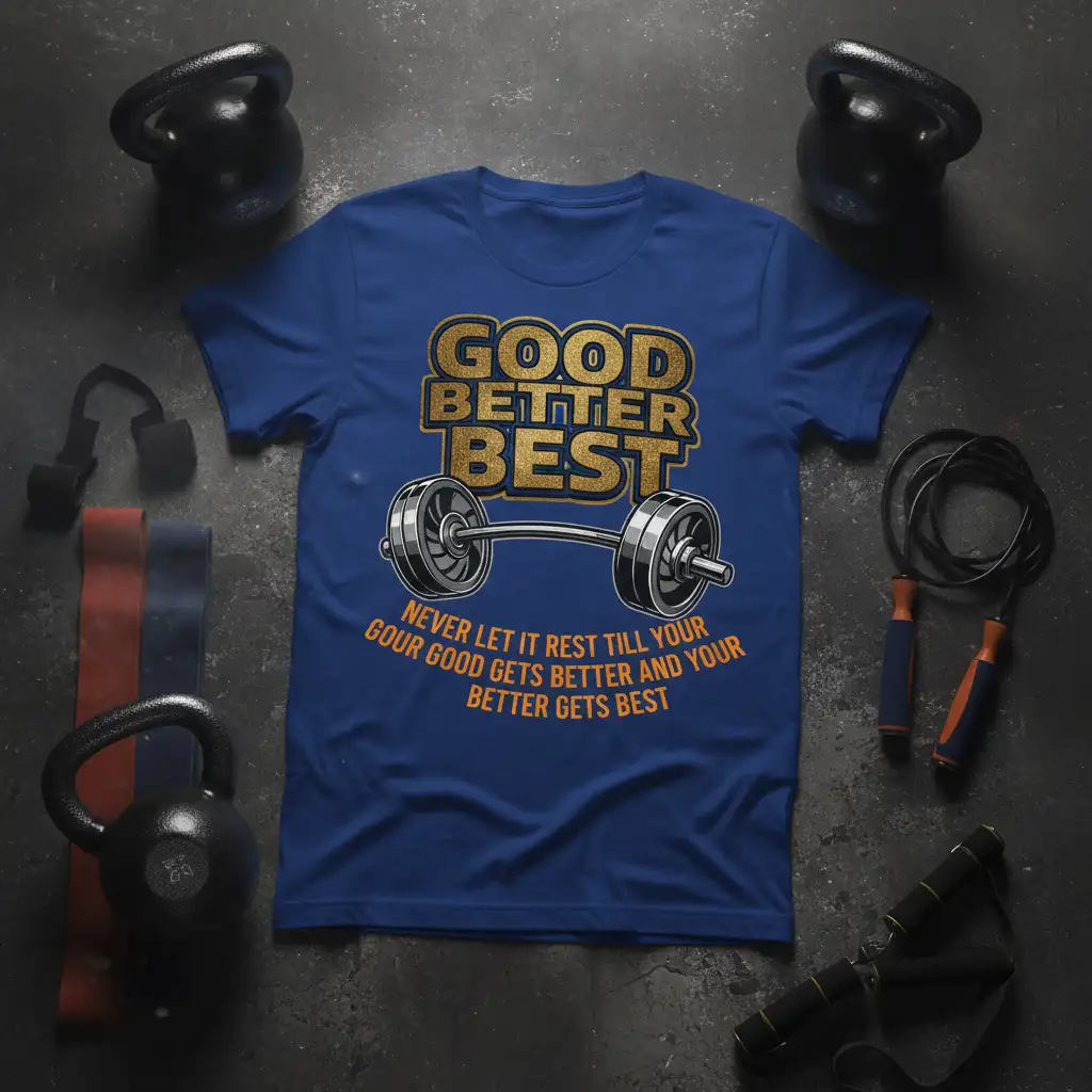 GOOD BETTER BEST NEVER LET IT REST TILL YOUR GOUR GOOD GETS BETTER AND YOUR BETTER GETS BEST is more than just a phrase; it’s a creed for those who are passionate about fitness and continuous self-improvement. This powerful quote, emblazoned on a high-quality t-shirt, serves as a constant reminder of the dedication required to achieve your goals. The design features bold, eye-catching gold lettering that stands out, making a statement about your commitment to excellence. It’s the perfect apparel for anyone who understands that progress is a journey, not a destination.