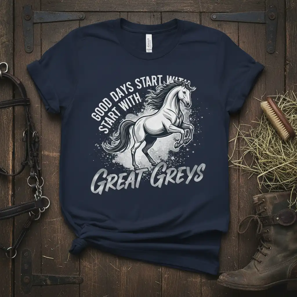 This t-shirt isn’t just clothing; it’s a reminder of the joy and peace that horses bring. The phrase “Good Days Start With Great Greys” serves as a cheerful affirmation, perfect for starting any day on a positive note. It’s a wonderful way to carry that equestrian spirit with you wherever you go, connecting with the broader community of horse lovers.