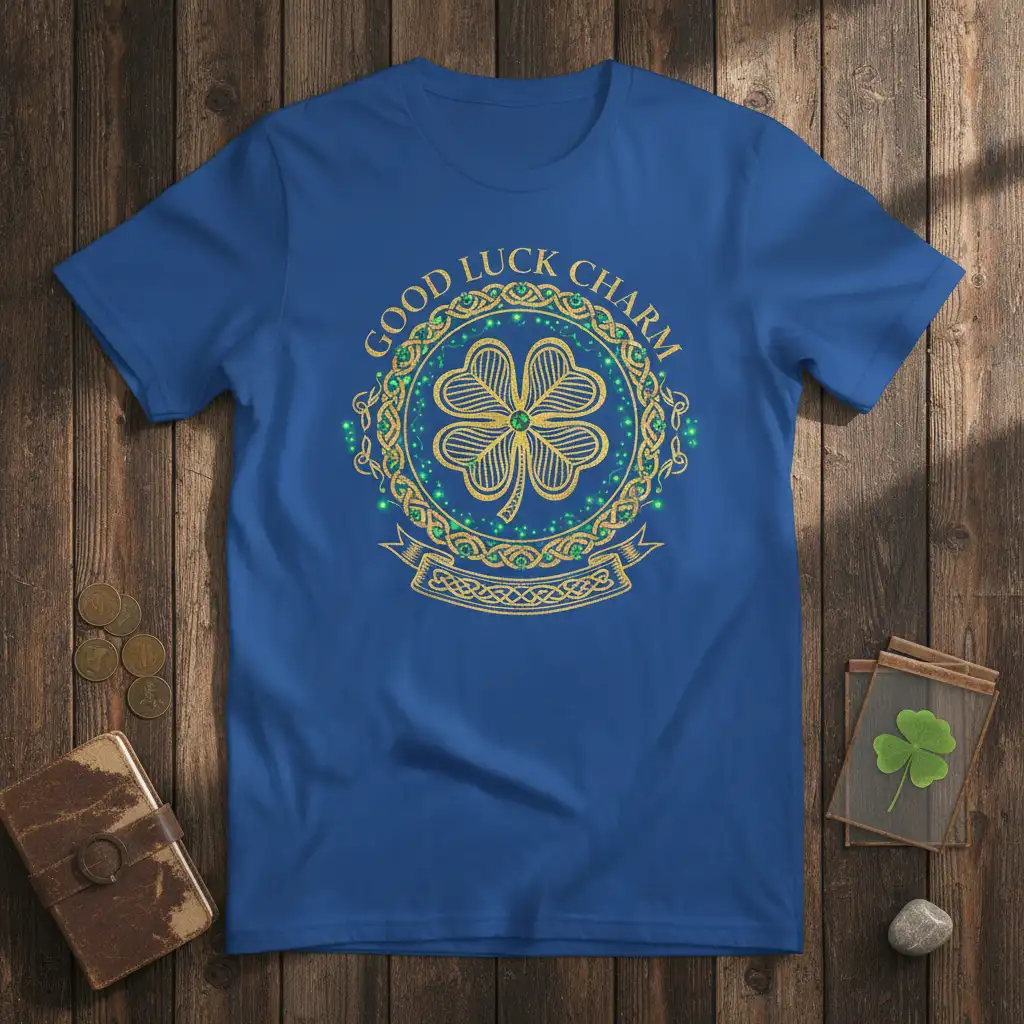 This Good Luck Charm tee is available in a range of classic and eye-catching colors designed to complement the intricate gold and green artwork. You can choose from timeless Black or Navy, vibrant Red, clean White, subtle Dark Heather, or the striking Royal blue seen in the featured image. Each color option provides a beautiful backdrop for the detailed design, ensuring it pops and makes a statement.