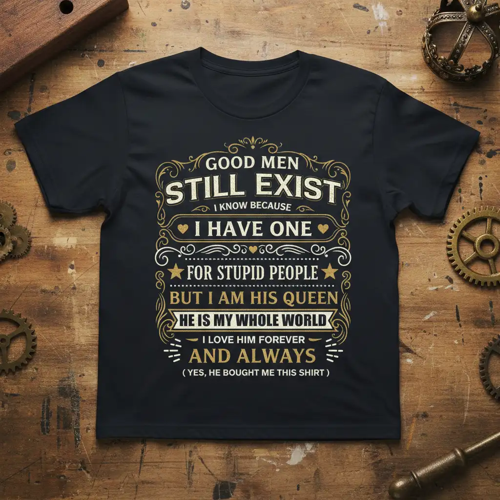 GOOD MEN STILL EXIST I KNOW BECAUSE I HAVE ONE FOR STUPID PEOPLE BUT I AM HIS QUEEN HE IS MY WHOLE WORLD I LOVE HIM FOREVER AND ALWAYS (YES, HE BOUGHT ME THIS SHIRT). This t-shirt is more than just apparel; it’s a declaration of love, a humorous statement, and a celebration of a special bond. Designed for the woman who knows her worth and cherishes her partner, this shirt speaks volumes about a relationship built on love, humor, and unwavering devotion. It’s the perfect way to express your feelings and share a laugh with others.