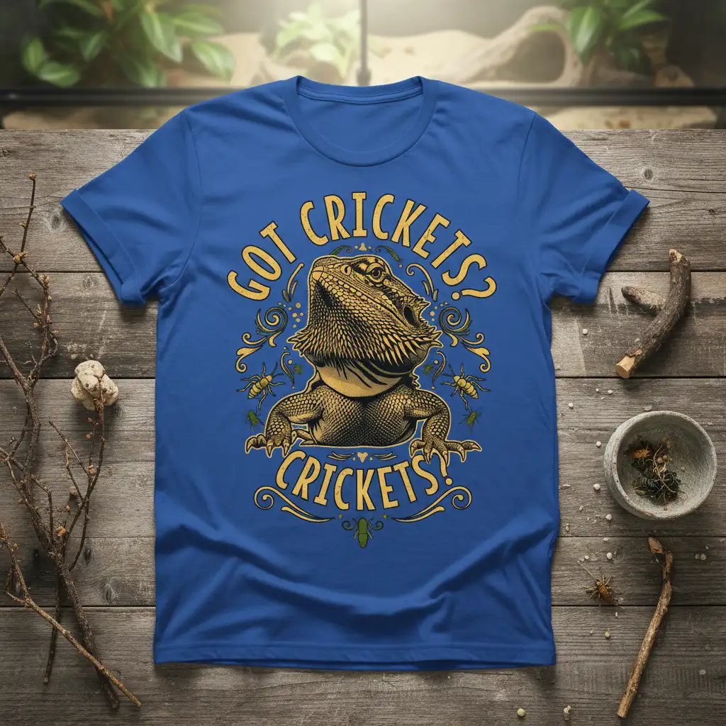 GOT CRICKETS? CRICKETS! This t-shirt is the ultimate statement piece for any bearded dragon owner or reptile enthusiast. It humorously captures the daily reality of keeping these fascinating creatures fed and happy. The design is not just a t-shirt; it’s a conversation starter and a badge of honor for those dedicated to their scaly companions. Perfect for everyday wear, this tee lets you express your unique passion for your reptilian friends. Show the world you understand the cricket-filled life with this fun and quirky garment.