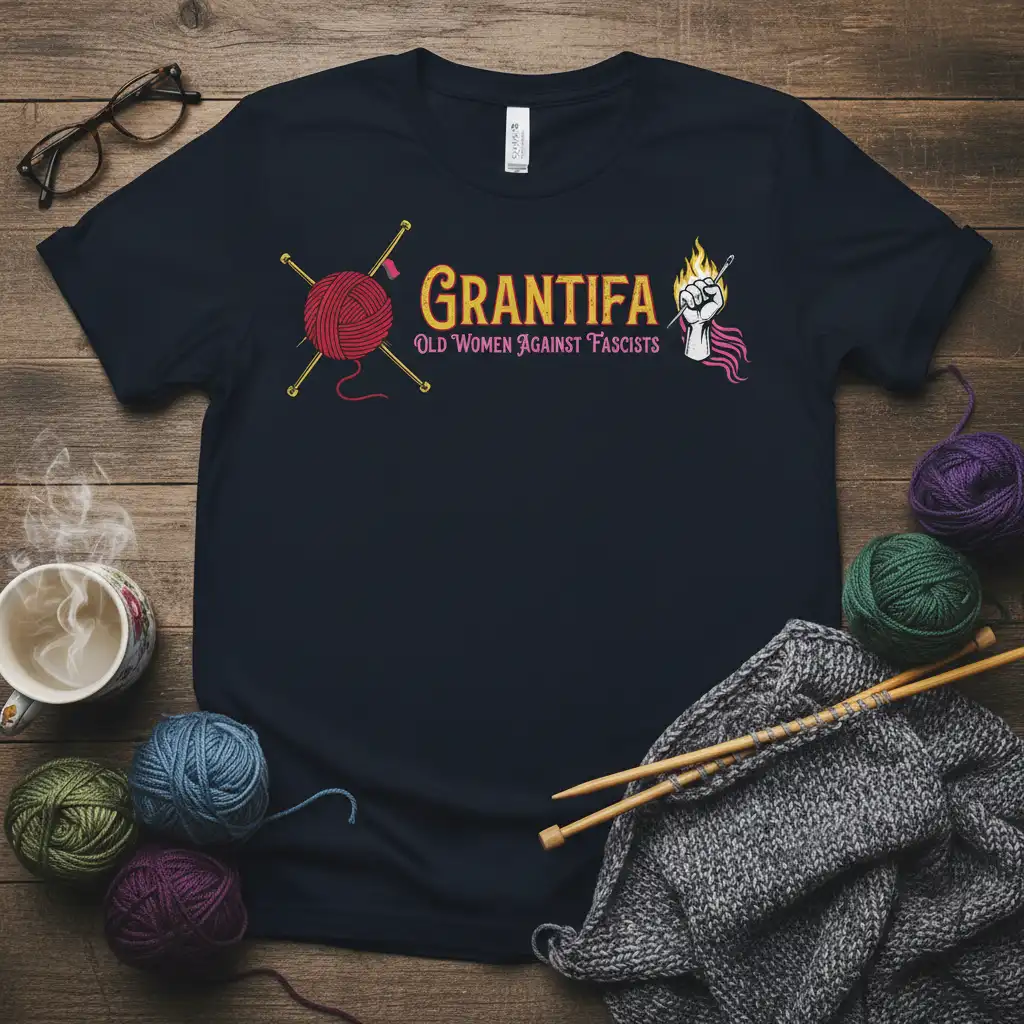 This distinctive t-shirt features the empowering slogan “Grantifa Old Women Against Fascists” in eye-catching typography. The design is enhanced with charming graphics that represent both knitting and activism. A ball of yarn intertwined with knitting needles sits on one side, symbolizing the craft and dedication often associated with grandmothers. On the other side, a raised fist, a universal symbol of protest and resistance, is depicted with fiery accents and flowing fabric, representing passion and determination.