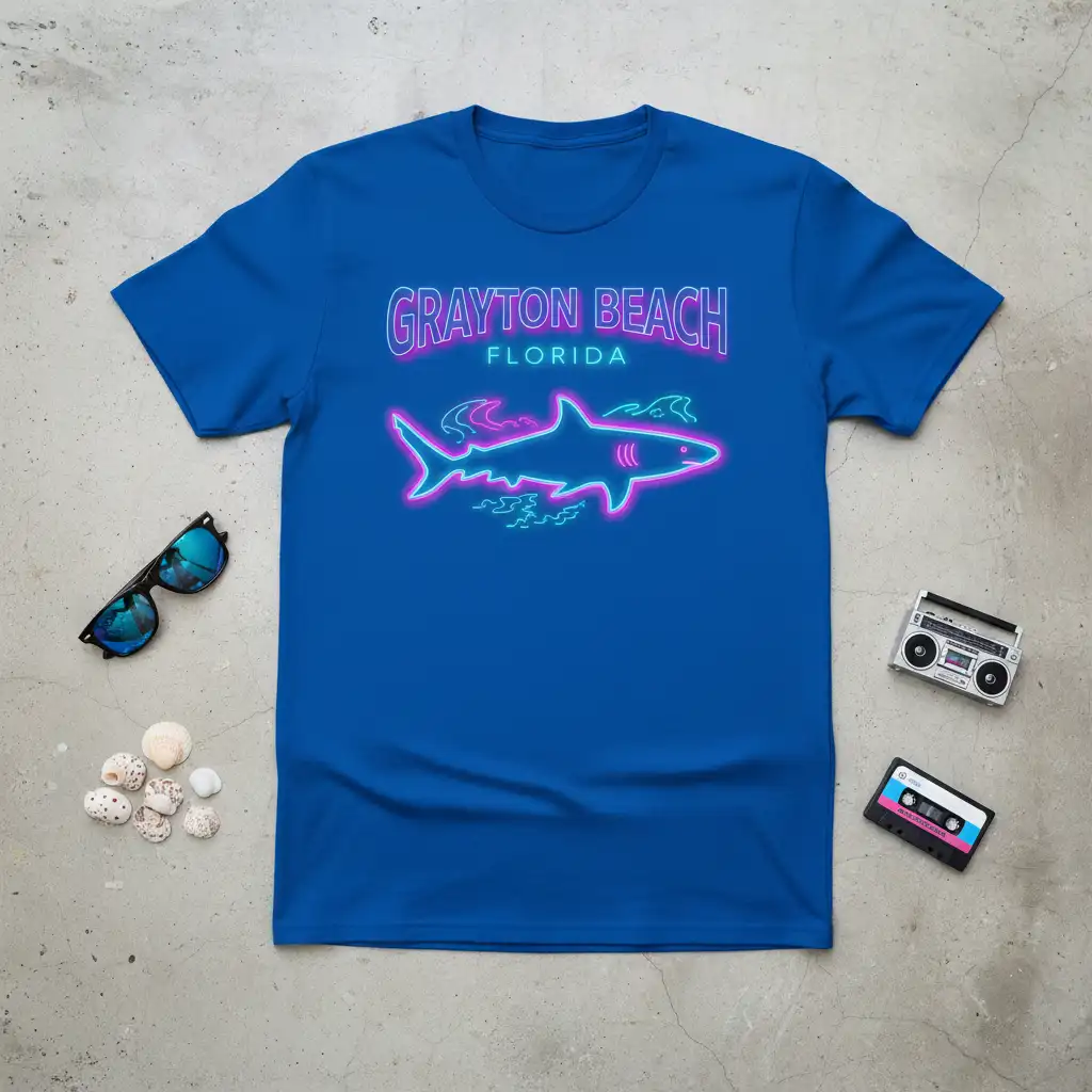 The “Grayton Beach Florida” text is rendered in a stylish, glowing font that perfectly complements the neon shark illustration below. This combination creates a visually appealing design that’s both modern and nostalgic. The neon effect adds a touch of playful energy, making the shirt perfect for casual wear during warm-weather adventures. It’s a must-have for your vacation wardrobe.