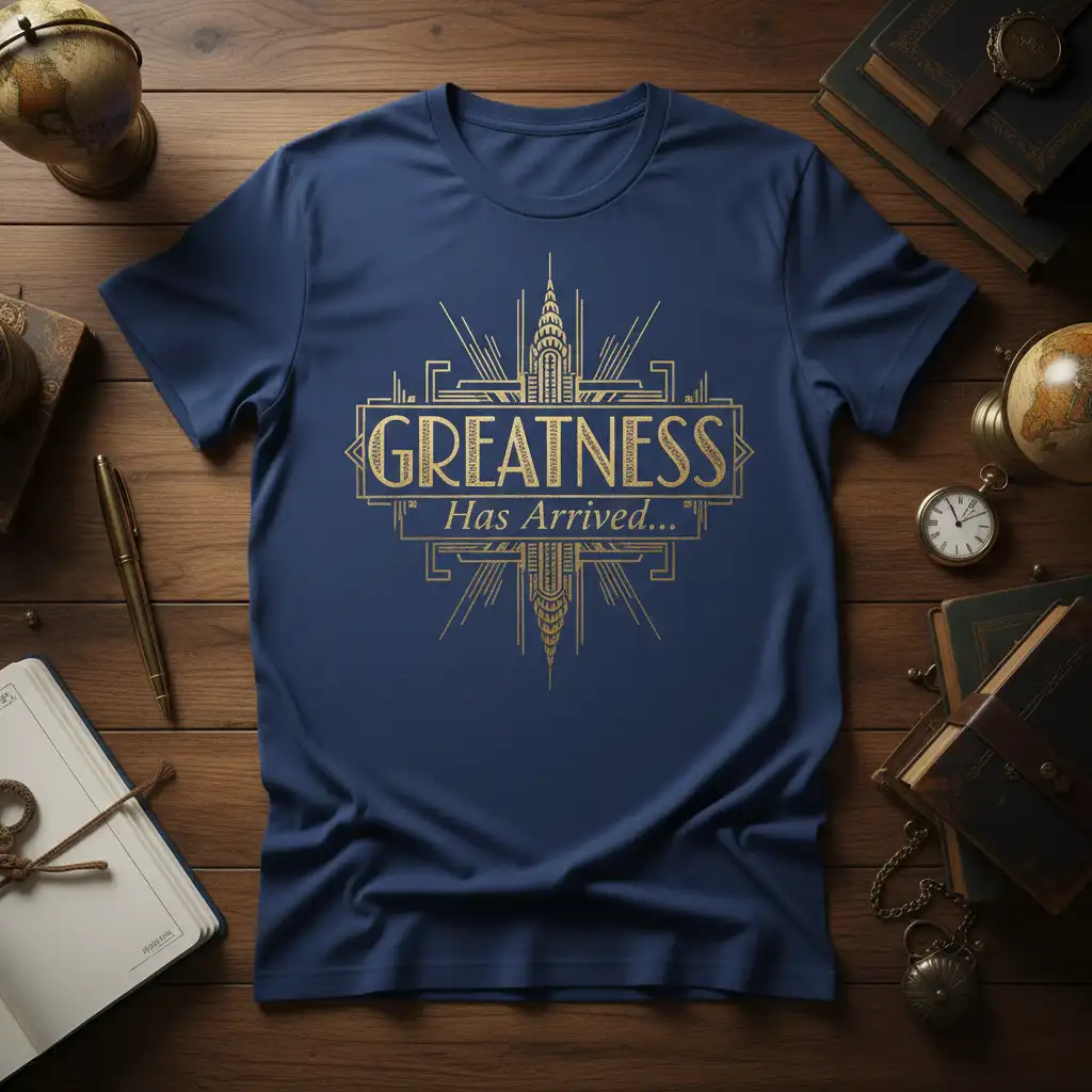 This unique t-shirt captures the essence of accomplishment with its elegant Art Deco motif. The phrase “GREATNESS Has Arrived…” is rendered in a classic, eye-catching font, surrounded by symmetrical golden lines and architectural elements reminiscent of the Roaring Twenties. It serves as a constant reminder of your hard work and dedication paying off. Wearing this tee signifies a moment of triumph and personal victory, making it an ideal choice for anyone who appreciates bold statements and timeless design.