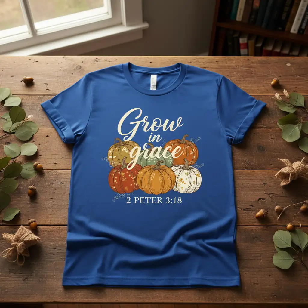 This inspiring t-shirt brings together a powerful biblical message with the cozy aesthetics of autumn. The phrase “Grow in grace” is elegantly scripted, accompanied by the specific scripture reference from 2 Peter 3:18, reminding wearers to continually cultivate their spiritual lives. The surrounding pumpkin graphics add a touch of seasonal charm, making this tee a delightful choice for anyone who cherishes their faith and the beauty of fall.
