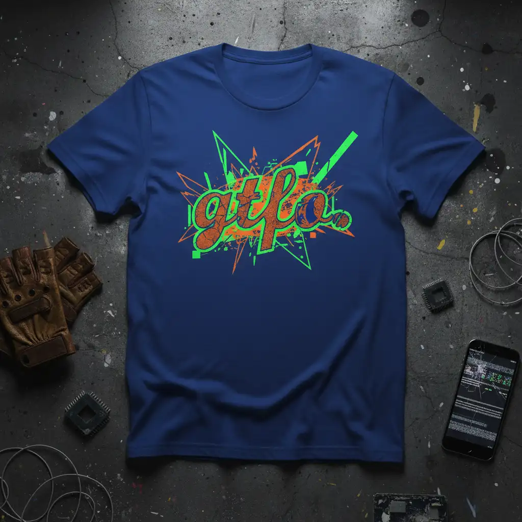 The “gtflo.” design is a testament to the power of street art, featuring bold, stylized lettering that commands attention. The interplay of bright orange and electric green against the dark background creates a visually arresting effect. This graphic tee is perfect for anyone who loves the vibrant, rebellious spirit of graffiti and urban culture. It’s designed to be a conversation starter, reflecting a passion for art and individuality.