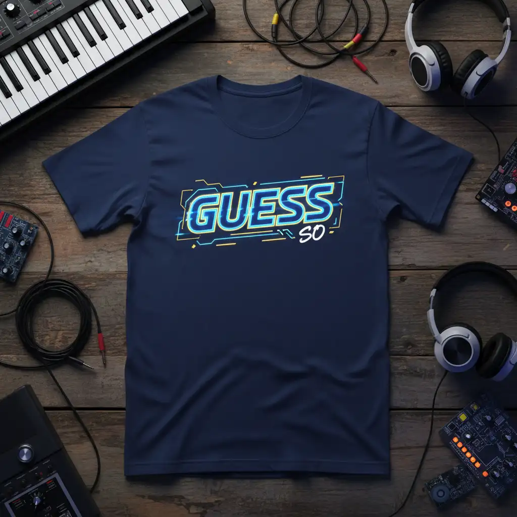 This unique graphic tee is designed for those who live and breathe the worlds of retro gaming and electronic music. The “Guess So” slogan is emblazoned in a captivating font that evokes the golden age of arcade games and early synthesizers. Its design elements, like the vibrant blue and yellow outlines and intricate circuit patterns, pay homage to the digital landscapes and technological innovations of the past.