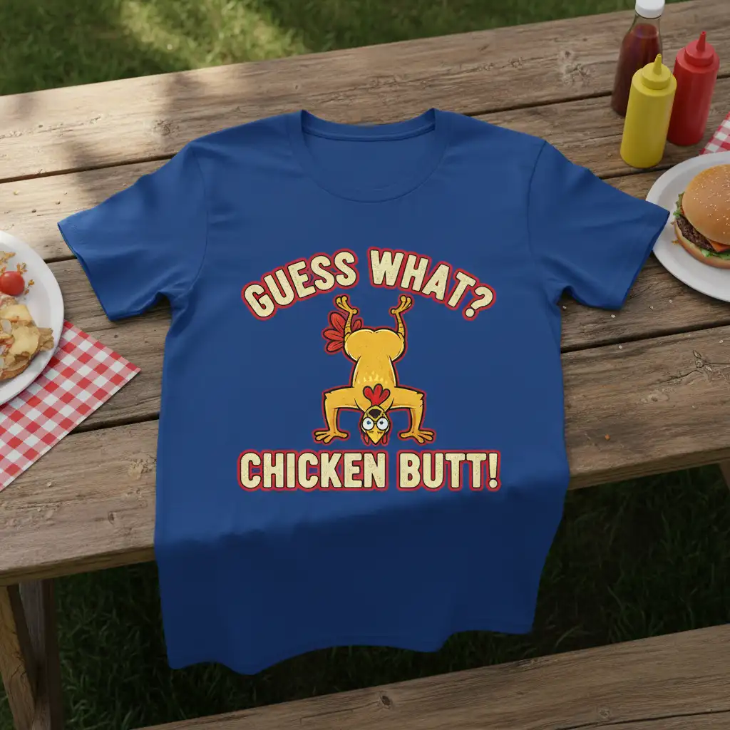 This GUESS WHAT? CHICKEN BUTT! design’s appeal lies in its directness and its ability to deliver a punchline with style. It’s a must-have for anyone who appreciates a good joke and isn’t afraid to show it. Wear it out and watch the smiles spread.