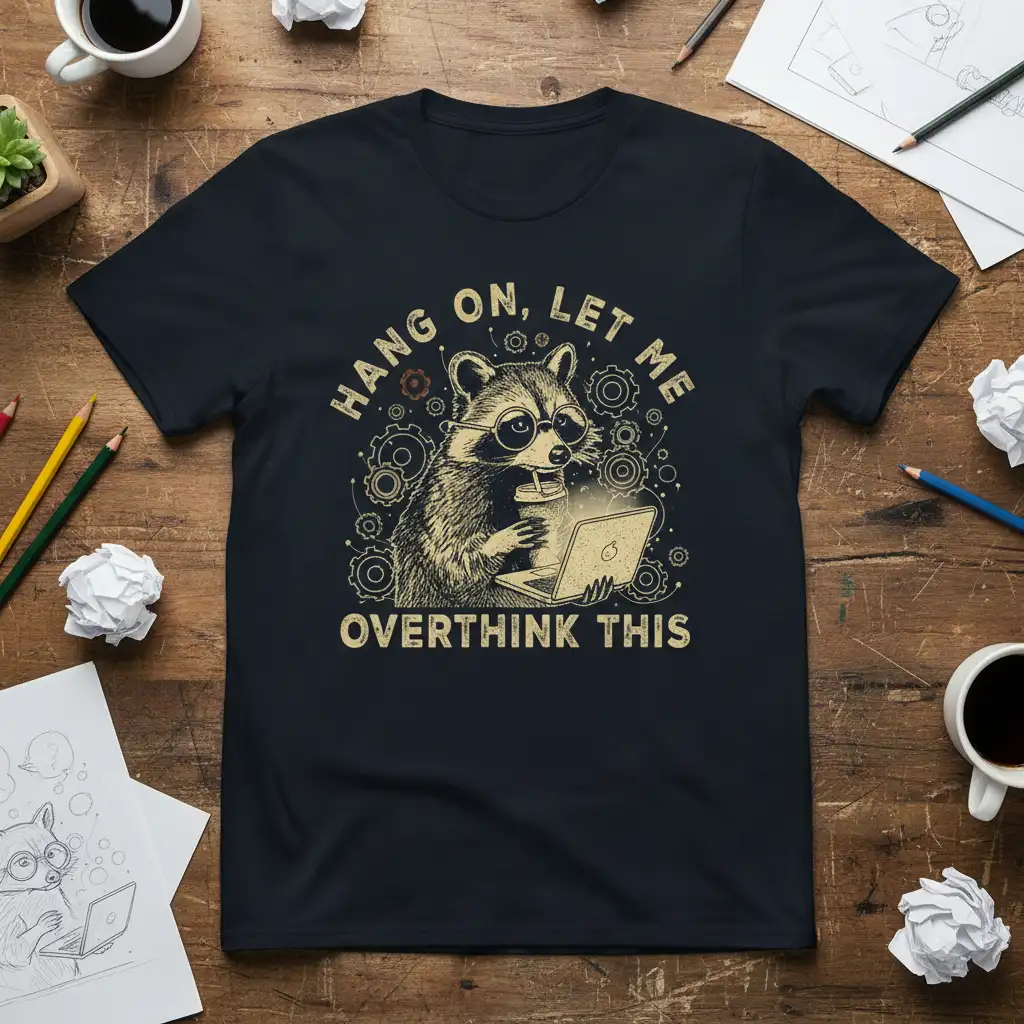 This t-shirt is a tribute to all the deep thinkers, the planners, and those who find themselves lost in thought. The central graphic features a raccoon, often associated with curiosity and sometimes a bit of mischief, depicted wearing glasses and intensely focused on a laptop. The surrounding gears and subtle digital effects add a layer of complexity, symbolizing the intricate mental processes of overthinking. It’s a design that resonates with many, offering a relatable and humorous take on a common human tendency.