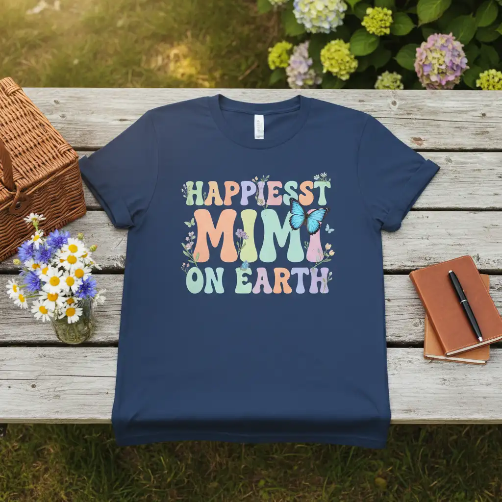 This unique t-shirt proudly showcases the phrase “Happiest Mimi On Earth” in a playful, multi-colored font that pops. Surrounding the text are beautifully illustrated butterflies and blooming flowers, adding a touch of whimsy and nature-inspired charm. The design evokes feelings of warmth, love, and the simple pleasures of family life. It’s a visual representation of the joy and happiness that grandmothers bring into our lives.