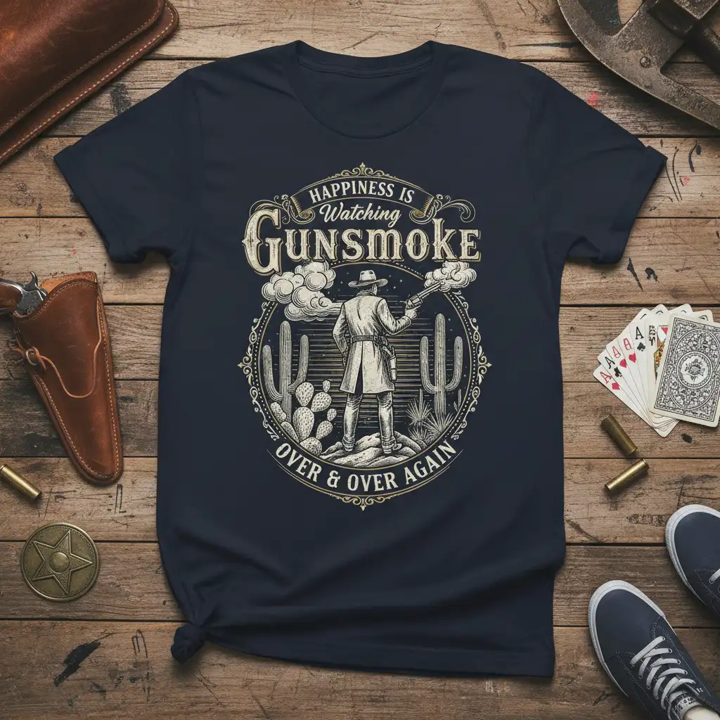 Embrace the spirit of the Wild West and snag your very own Happiness Is Watching Gunsmoke Over & Over Again tee to relive those classic moments.