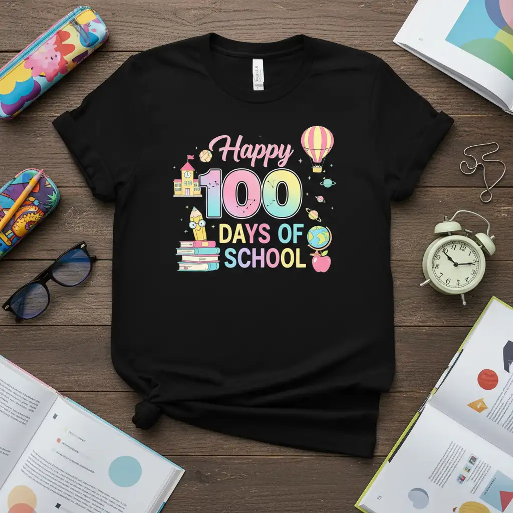 This Happy 100 Days of School t-shirt is crafted with comfort and durability in mind, making it ideal for everyday wear. The playful design features the celebratory phrase alongside charming graphics like a schoolhouse, a stack of books with a pencil, a hot air balloon, and planets. These elements combine to create a visually engaging piece that resonates with the excitement of reaching this educational milestone.