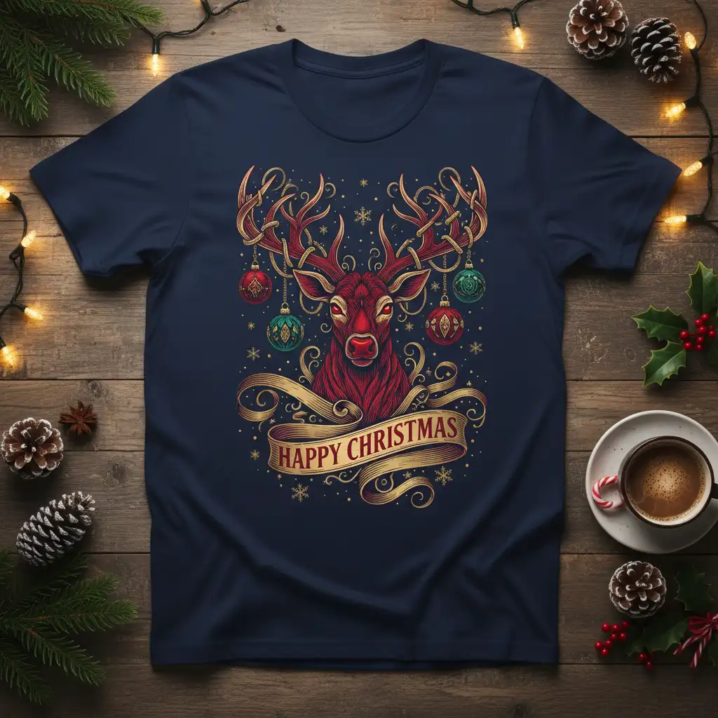 Happy Christmas greetings are elegantly conveyed on this unique t-shirt, designed to bring festive cheer to your wardrobe. This garment is more than just apparel; it’s a wearable celebration of the holiday season, perfect for anyone who embraces the joy and warmth of Christmas. The intricate design features a majestic reindeer, symbolizing winter wonder and holiday spirit, making it an ideal choice for festive gatherings and casual wear alike.